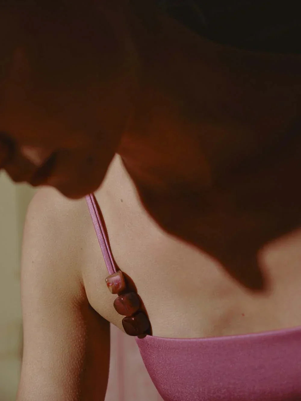 Introducing the "Alice Bikini Top" in Blush – a bikini top with a square neckline, lined design, and added wire and padding for support. The embellished straps add a unique touch. Pair with the matching Alice Bikini Bottom for a complete look.