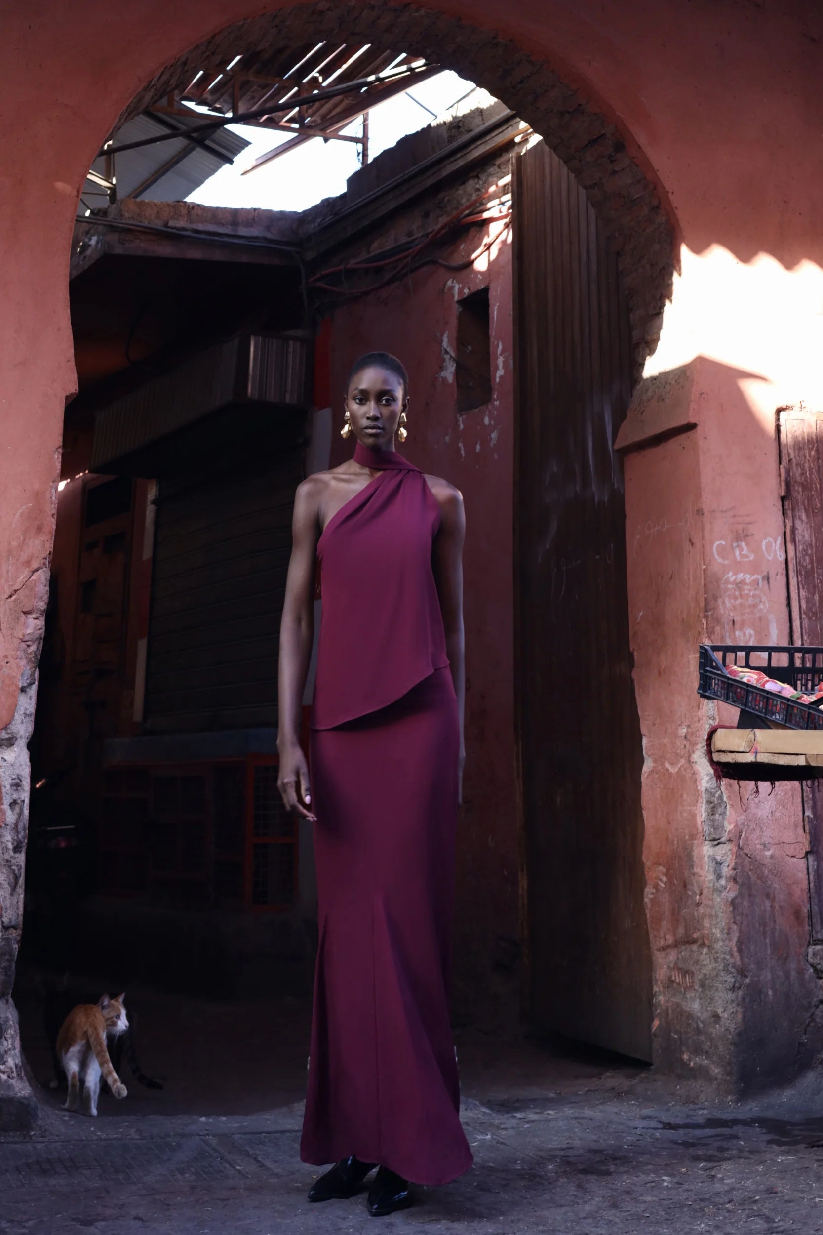 Introducing the "Ari Top" in Burgundy – a one-shoulder silhouette with an open back and flowing scarf detail. Designed with an asymmetrical hem and finished with a back zipper closure. Fully lined for coverage. Pair it with the matching bottom for a coordinated look.