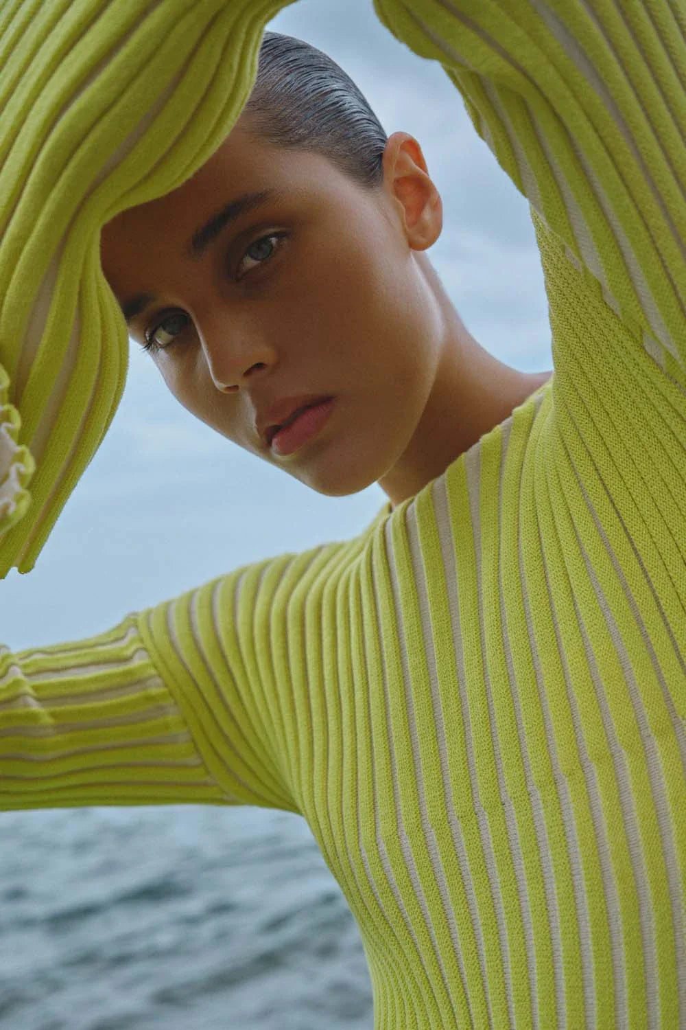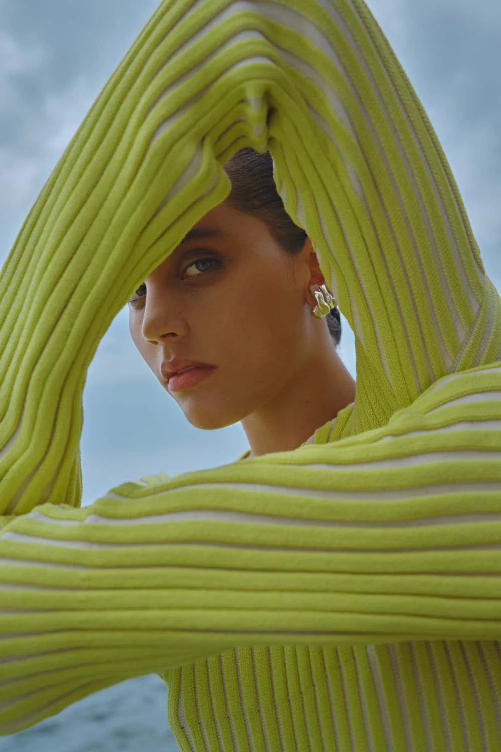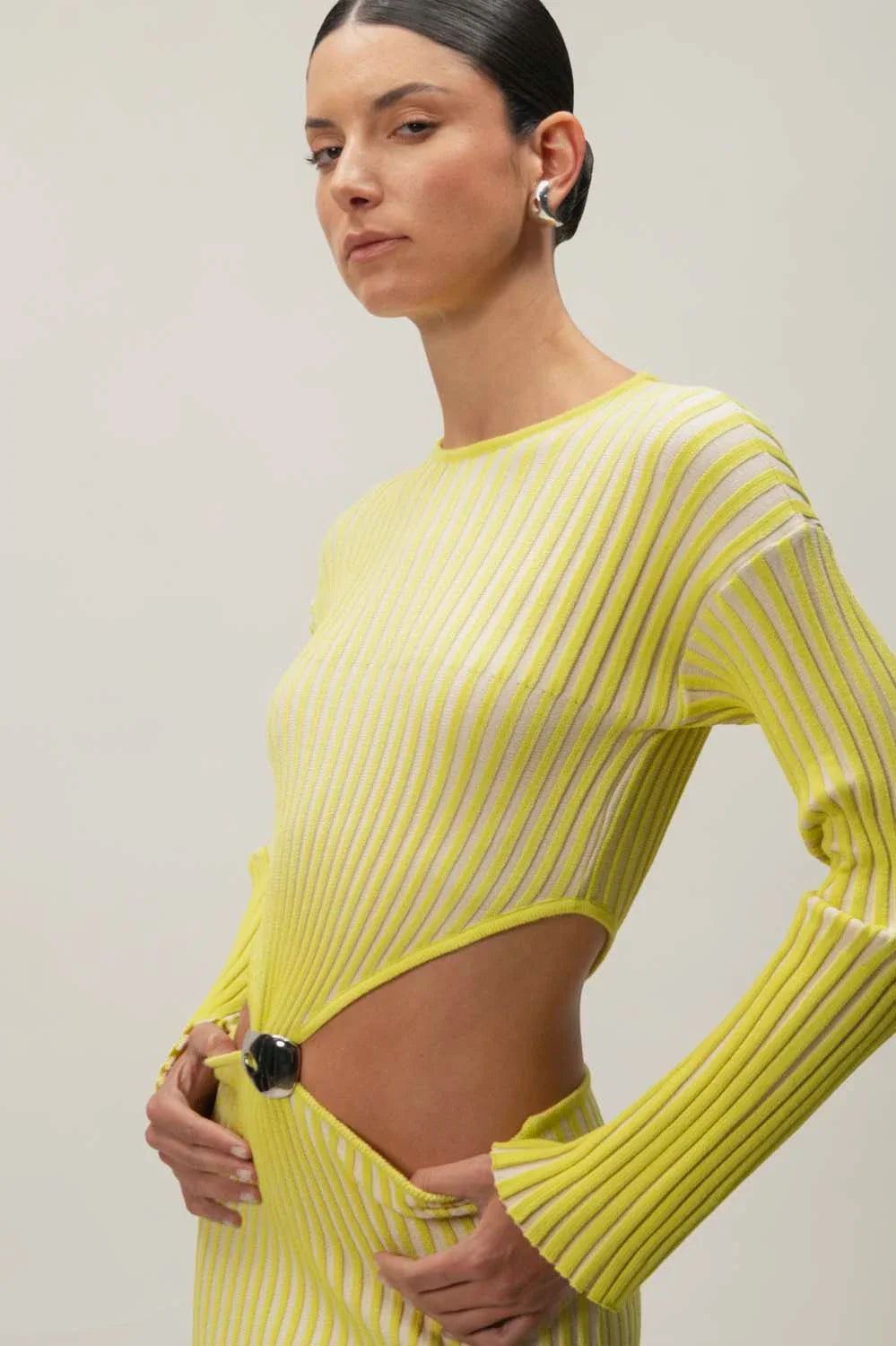 Introducing the "Bentley Dress" in Lima Limon – This long-sleeve knit dress blends classic elegance with a modern twist. The crew neckline and pleated skirt offer timeless style, while the waist cutout with a Baobab-shaped detail adds a contemporary touch. Perfect for elevating your look at any event.