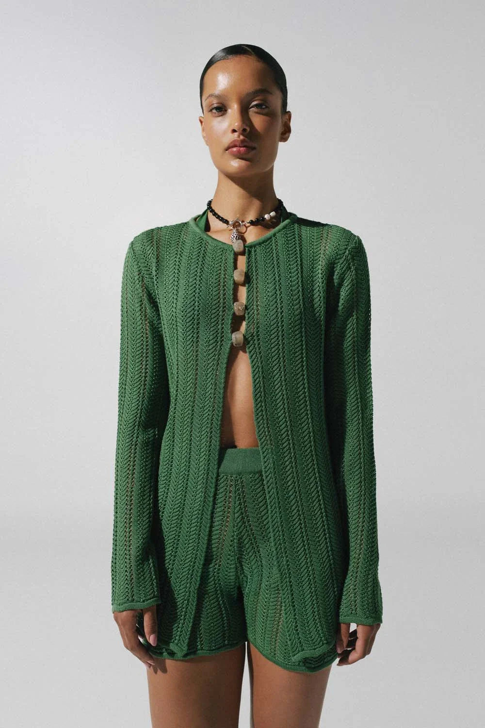 Introducing the "Camper Shorts" in Evergreen – high-waisted shorts in a sheer knit fabric with an elastic waistband for a flexible fit. Unlined for a lightweight feel. Pair with the matching Camper Top for a coordinated look.