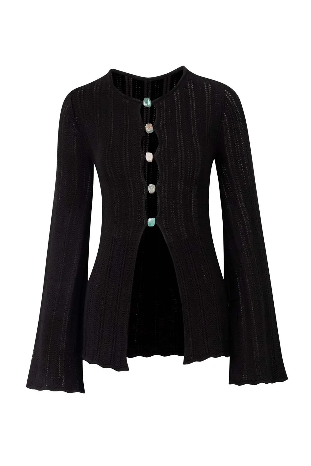 Introducing the "Corsica Top" in Black – a top with a round neckline, sheer knit fabric, and front cutouts. Designed with a front opening and embellishments for added detail. Unlined for a lightweight feel. Pair with matching pants for a coordinated look.