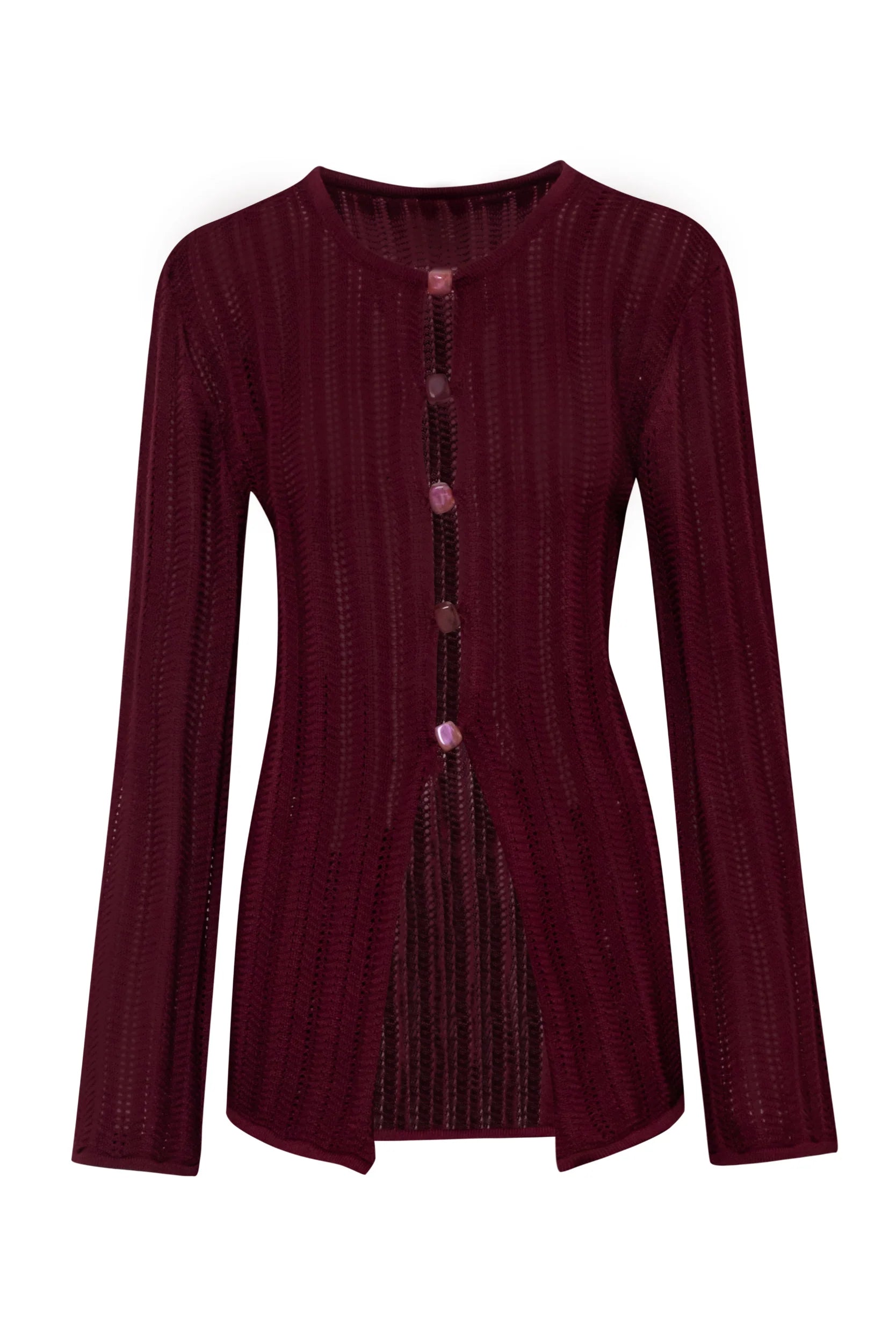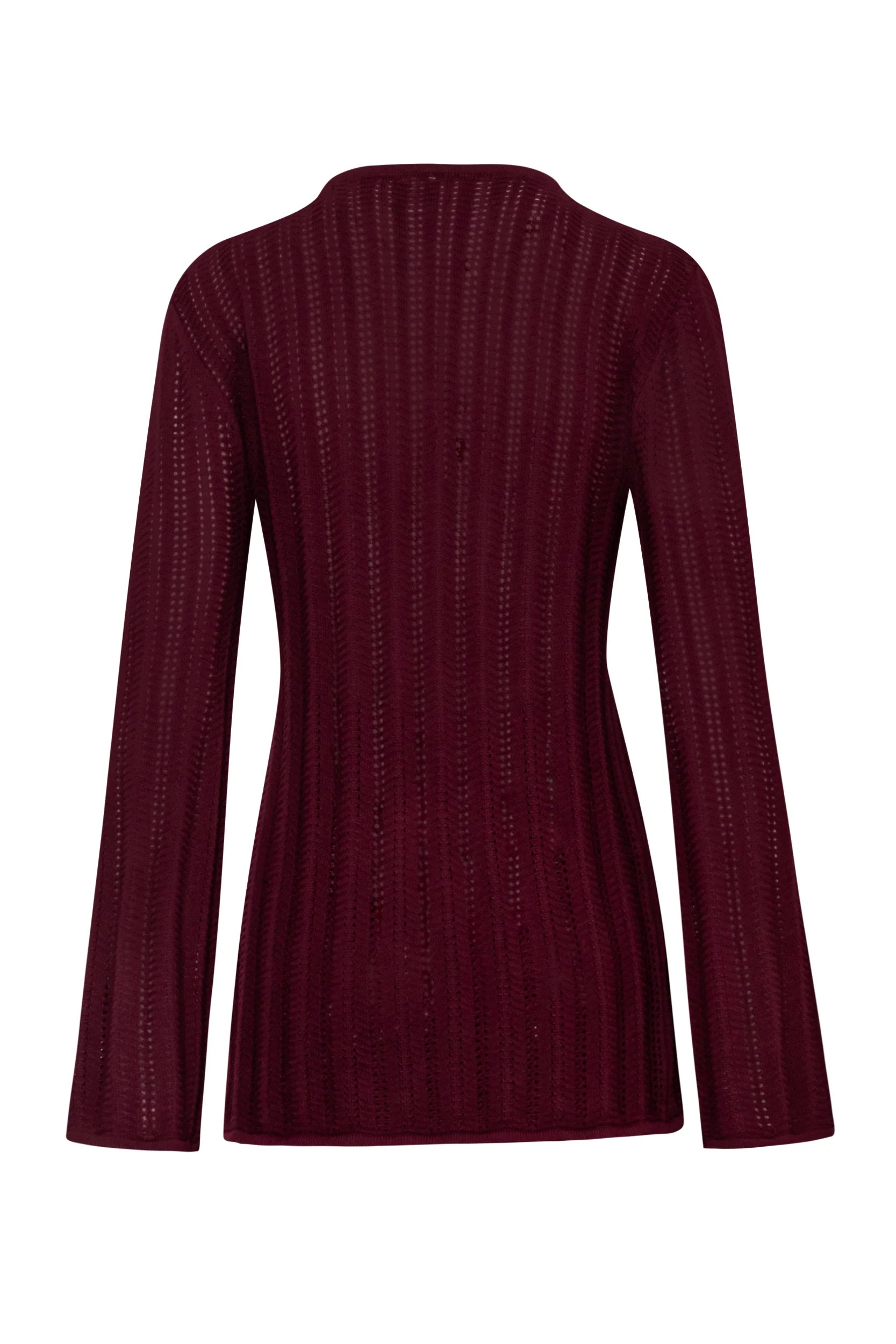 Introducing the "Corsica Top" in Burgundy – a sheer knit top detailed with front cutouts and a central opening. Designed with a round neckline, long sleeves, and embellished accents. Unlined for a lightweight finish. Pair it with the matching bottom for a coordinated look.