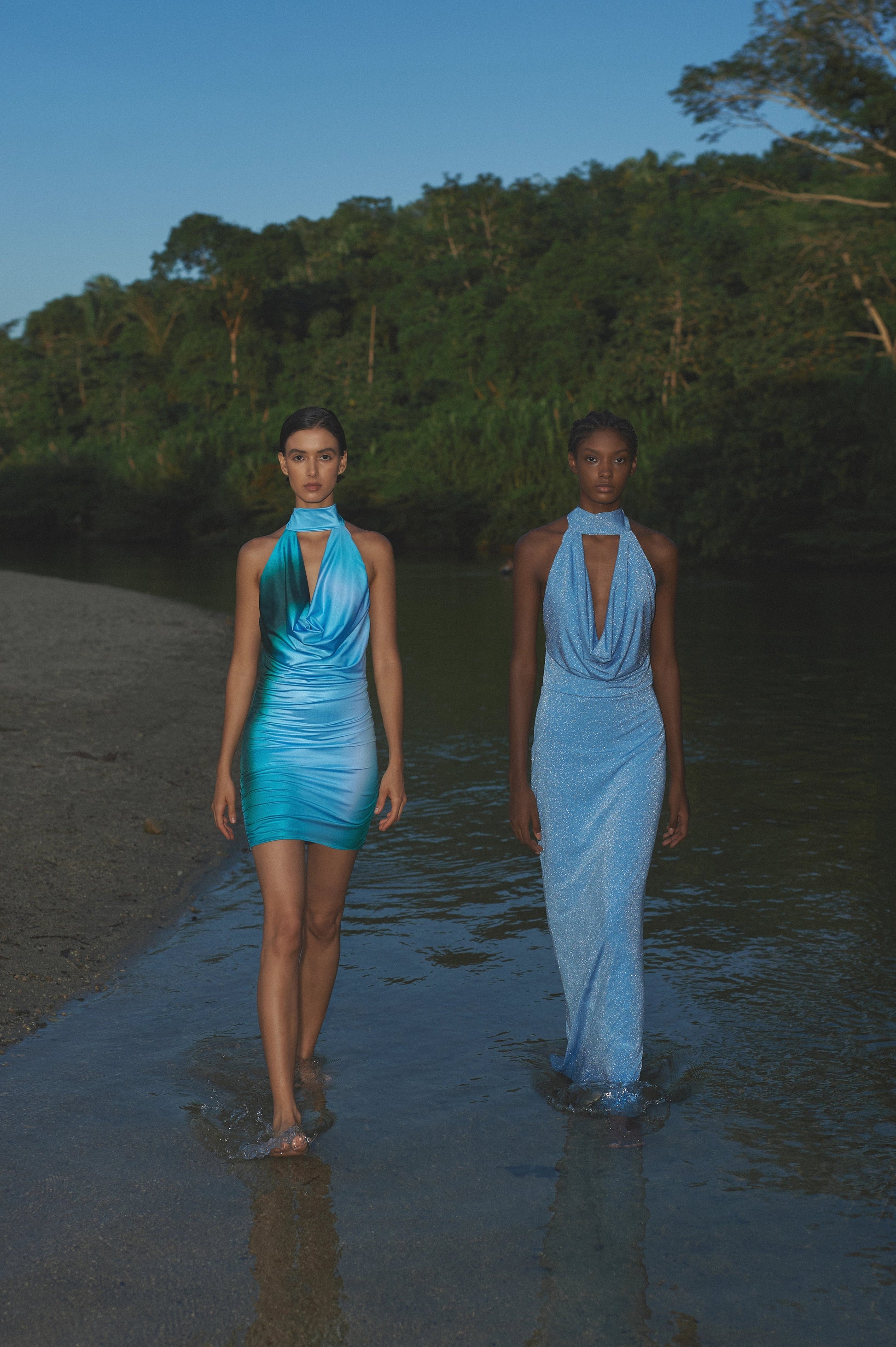 Introducing the "Donna Dress" in Notte – a stunning mini dress with a halter neck that ties at the back and a deep V-neckline that drapes elegantly. The dress features an open back, creating a bold and alluring look. Fitted to the body and fully ruched, it accentuates your curves beautifully. Perfect for a night out or a special event.