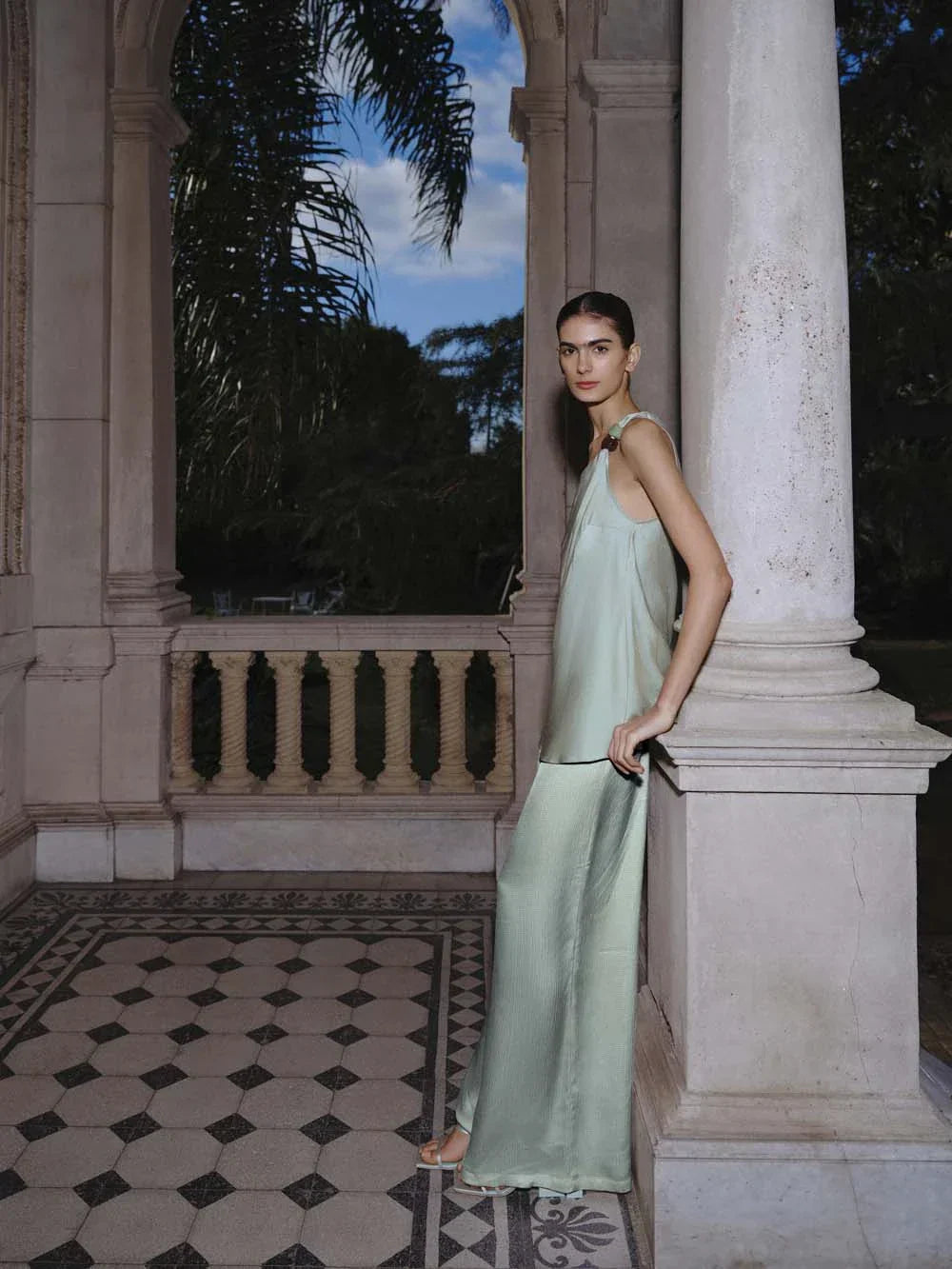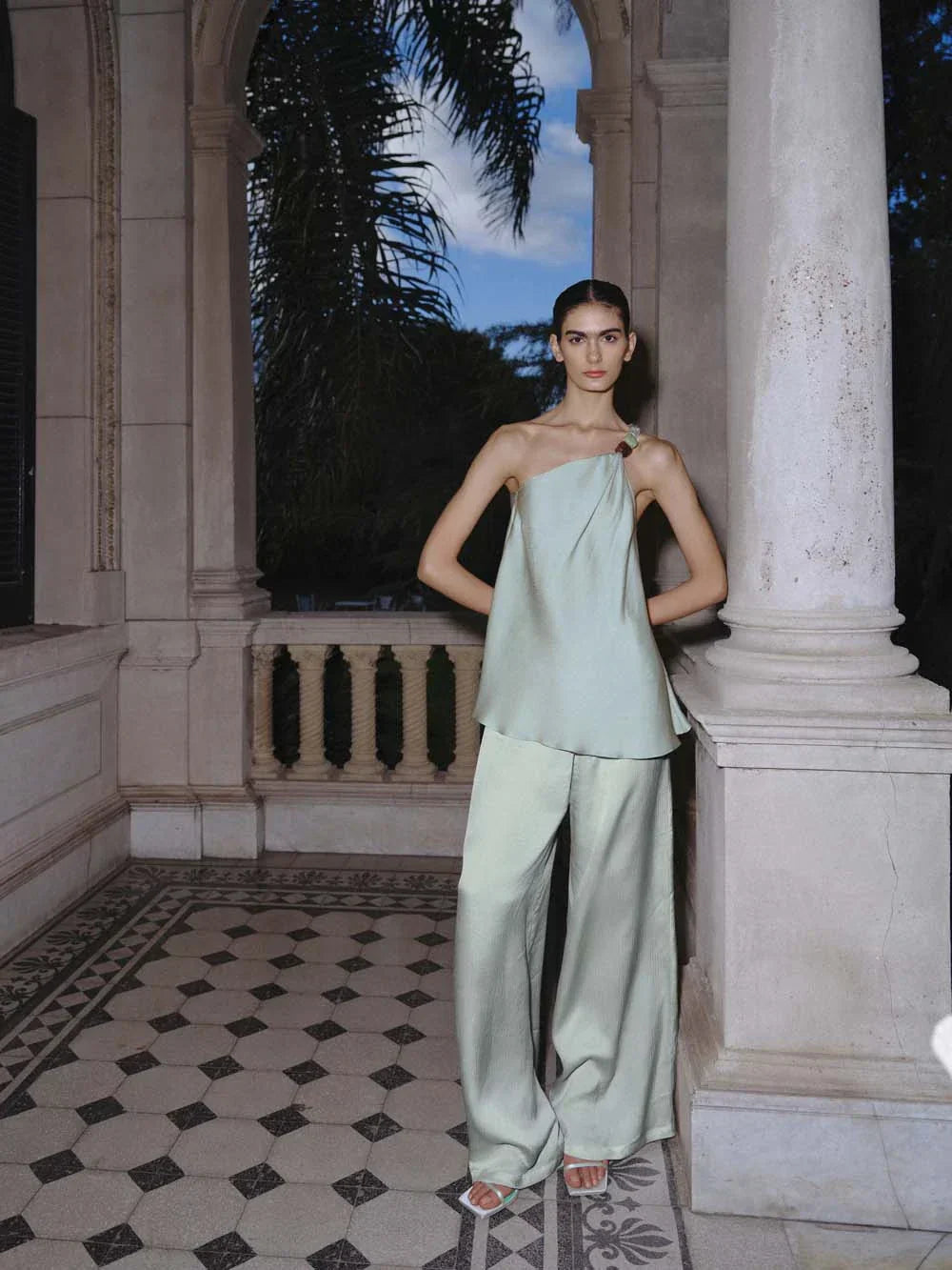 Introducing the "Ferrat Top" in Matcha – a one-shoulder top featuring delicate embellishments for a distinctive touch. Fully lined for coverage and comfort. Pair with the matching Ferrat Pants for a coordinated look.