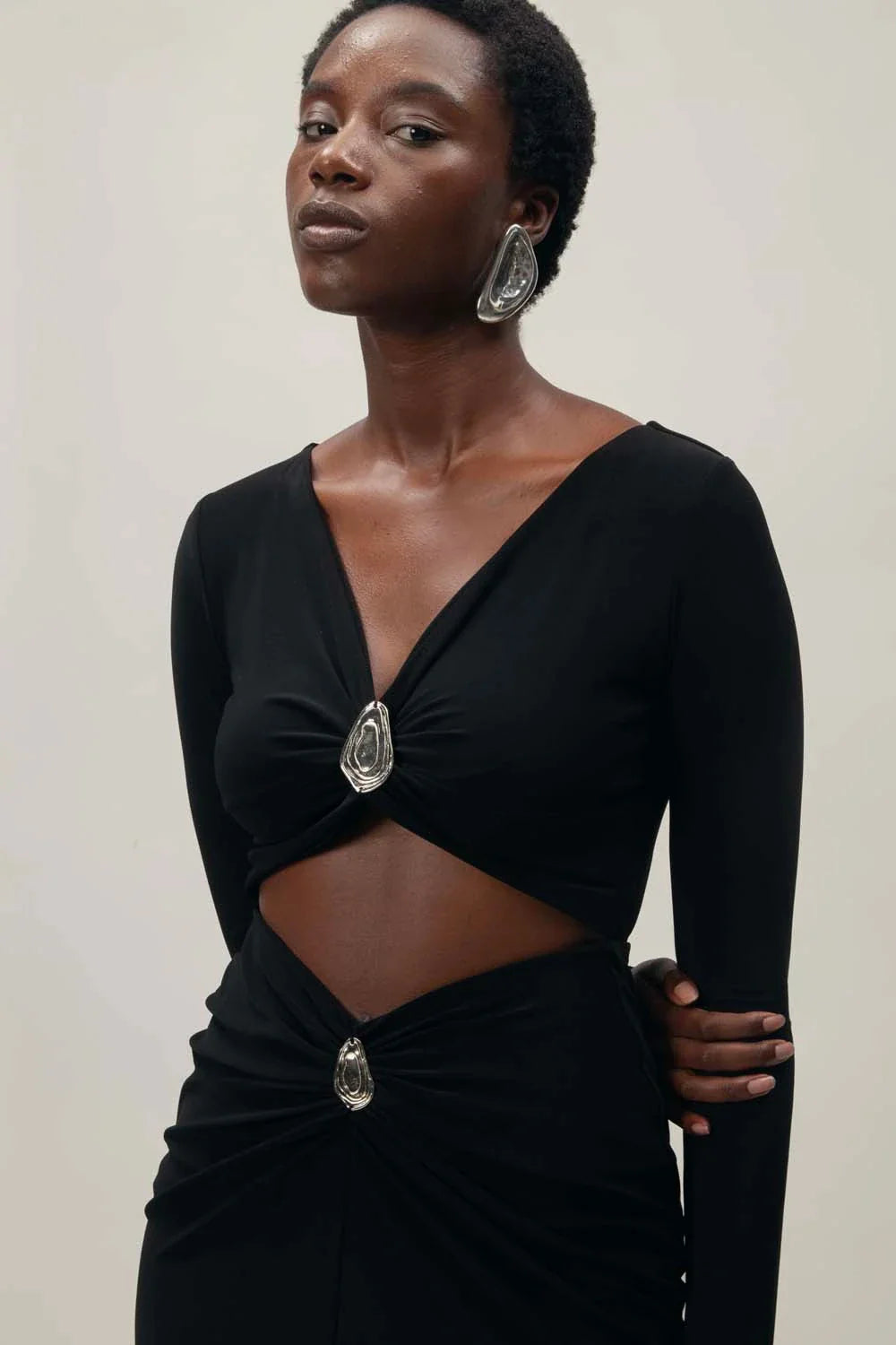 Introducing the "Fiore Maxi Dress" in Ombra – a maxi dress featuring a deep V-neckline, front cutouts, and a Baobab-shaped embellishment. Designed with a V-shaped waistband, ruched detailing, and a front slit. Partially lined for a fluid silhouette.