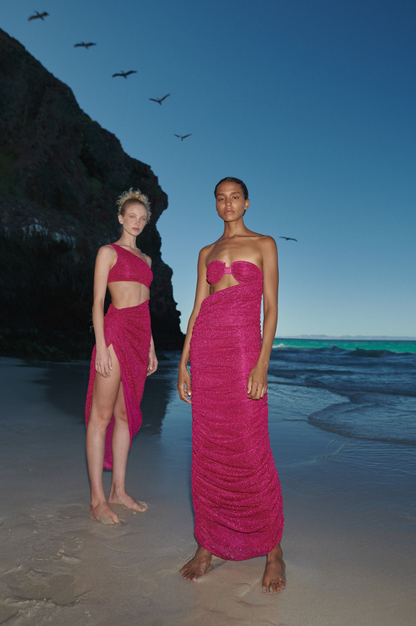--Introducing one of our all-time favorites, the "Gioia Pareo" in Fuchsia - With its ethereal silhouette and glossy details, this maxi pareo that doubles as a dress makes the perfect day-to-night outfit. Crafted sustainably, this ruched maxi skirt with glossy details elevates every look. Pair it with the "Gioia Bikini" for the perfect beach-to-bar outfit.