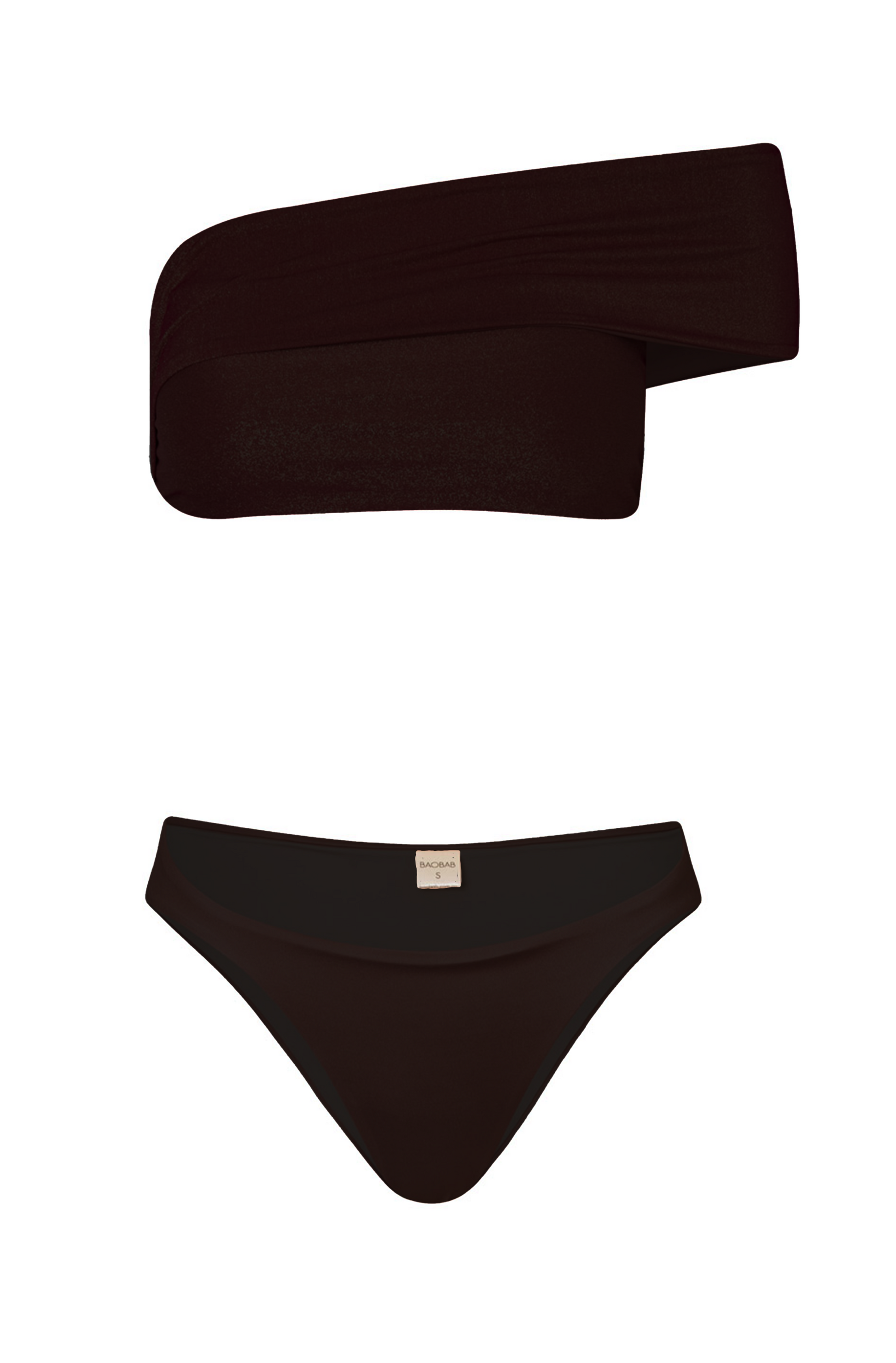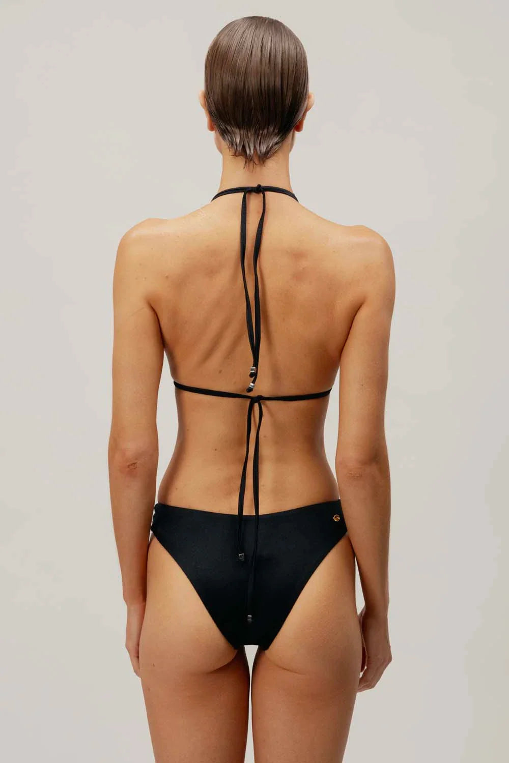 Introducing the "Goa Bottom" in Black - Where luxury beachwear meets captivating design. Made from a lycra figure holding glossy fabric, this sustainable two-piece with glossy details features a high-cut bikini bottom and a one-shoulder bikini top, making it the perfect resort wear pick. Elevate your beach experience with the "Goa Bikini" a symphony of versatility, design, and conscious fashion.