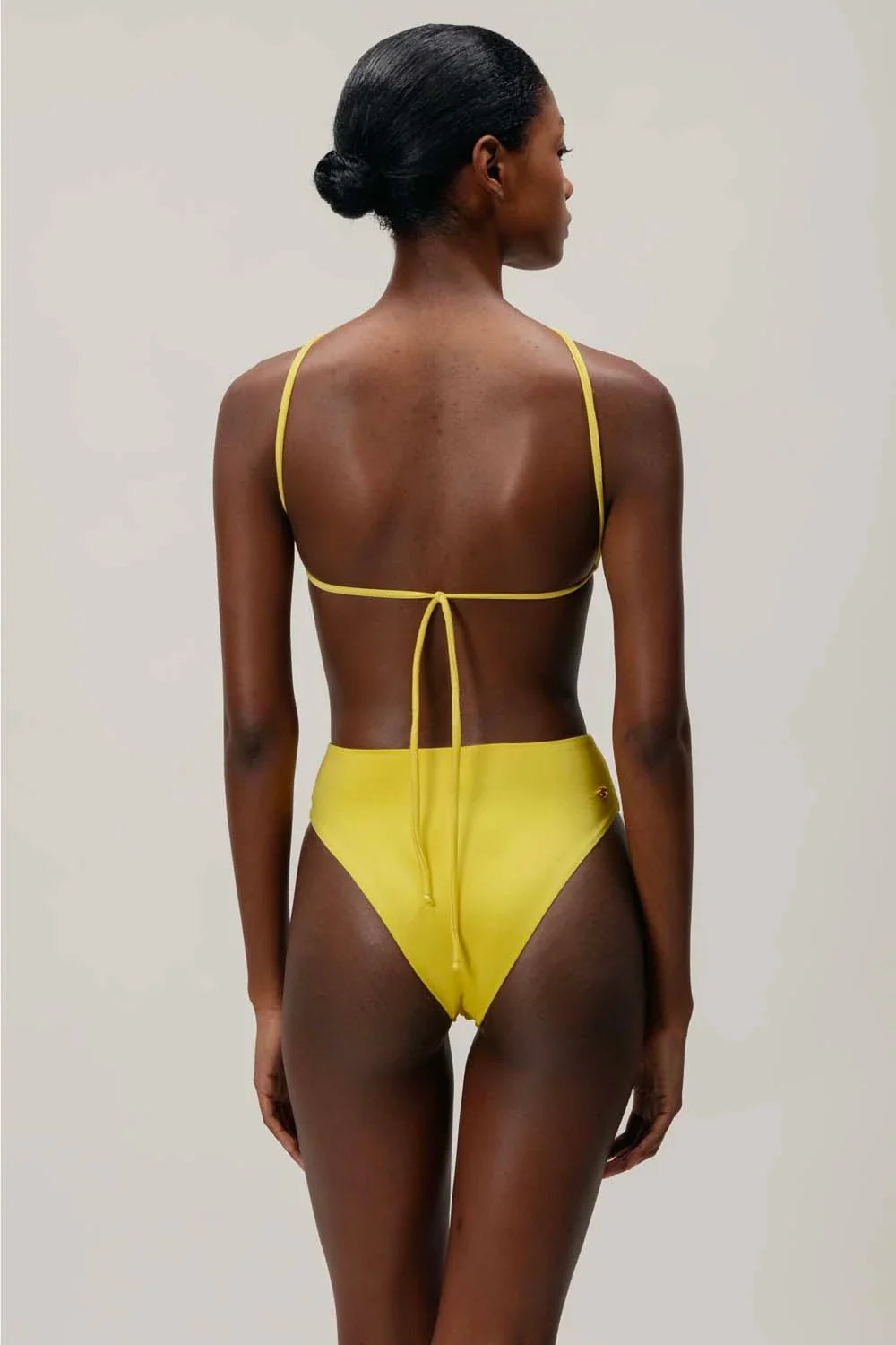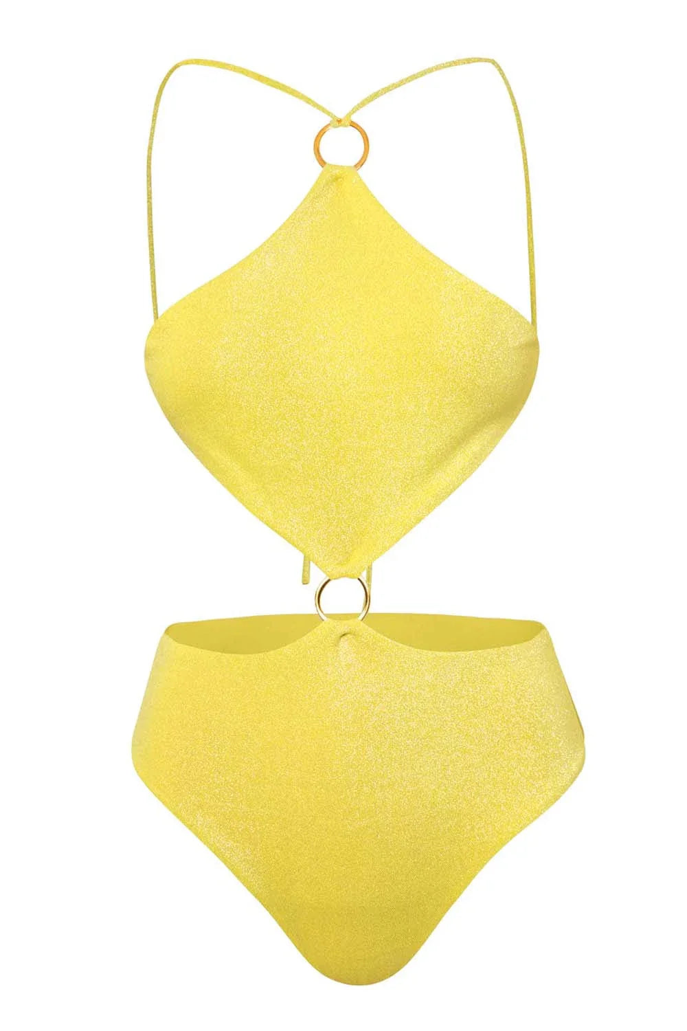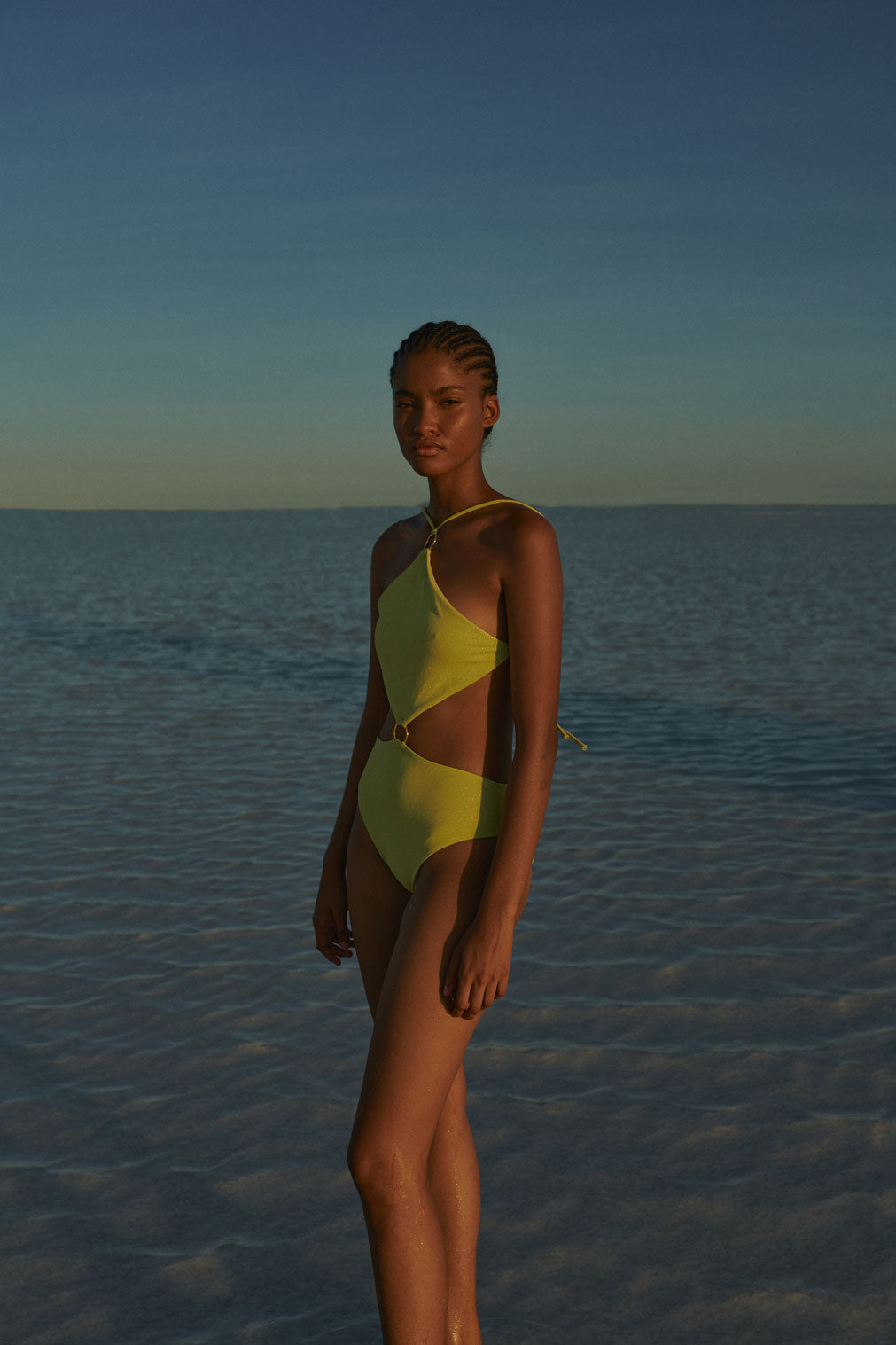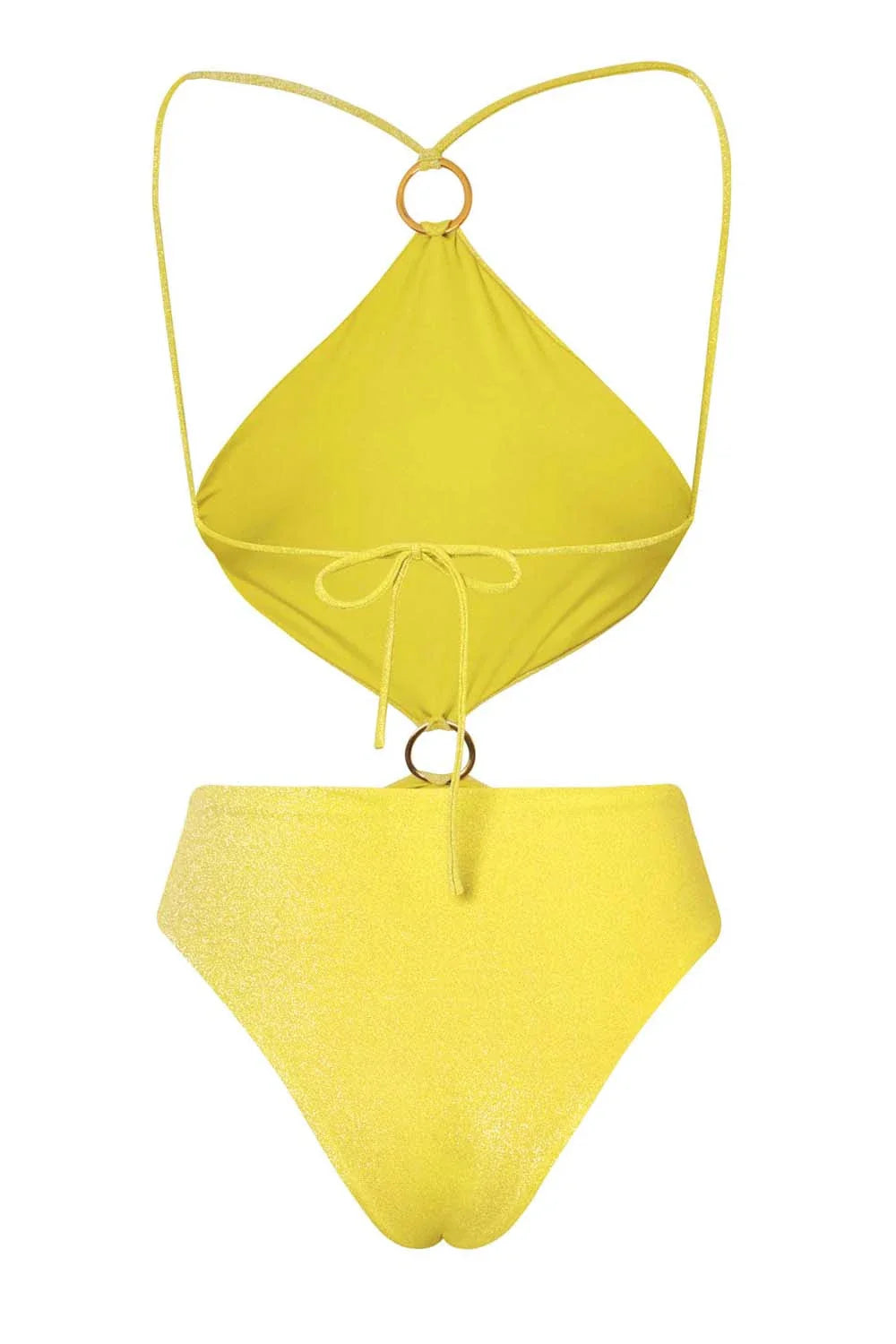 Introducing the "Kira One Piece" in Light Sunset - Discover the epitome of luxury beachwear with our high neck one piece with a hardware detail. Embrace the enchantment of our sustainable swimwear collection, made from a lycra figure-holding fabric with glossy details, this cutout one-piece showcases the captivating power of refined and sustainable swimwear, designed to seamlessly blend style and fashion consciousness.