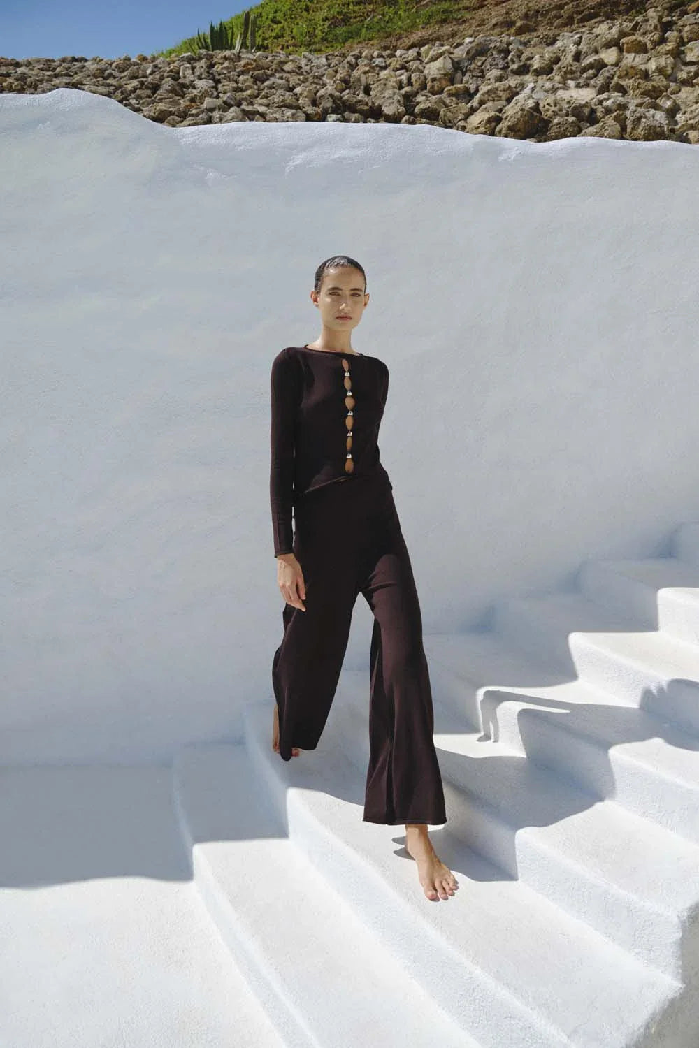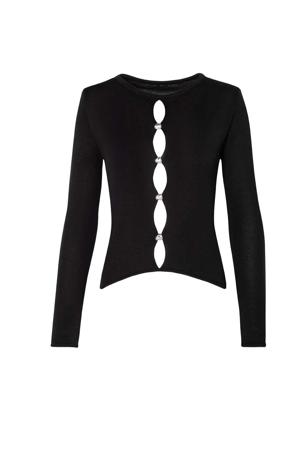 Introducing the "Kyoto Set Top" in Charcoal – this long-sleeved top features a round neckline and a vertical row of silver buttons with the Baobab-shaped down the front. Each button is accented by cutouts, adding a touch of modern sophistication. The fitted design enhances the body for a sleek and stylish look. Pair it with the matching Kyoto Set Pants for a coordinated look.