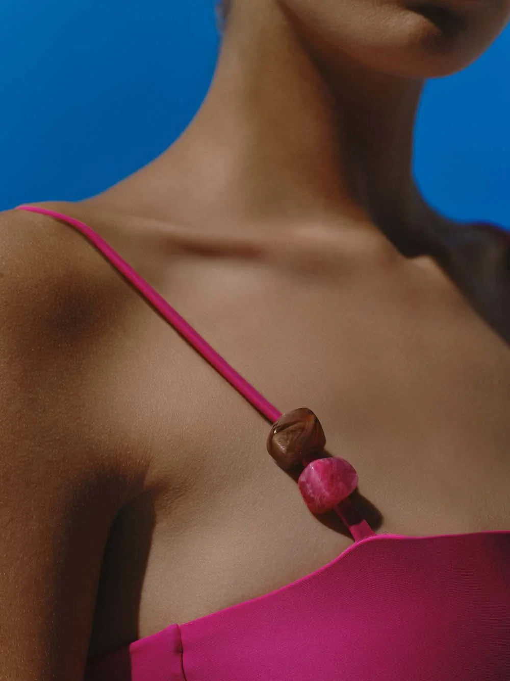 Introducing the "Lola One Piece" in Fucsia – an asymmetrical silhouette with a single adjustable strap and delicate embellishments. Fully lined for coverage and comfort, with no underwire or padding for a natural fit.