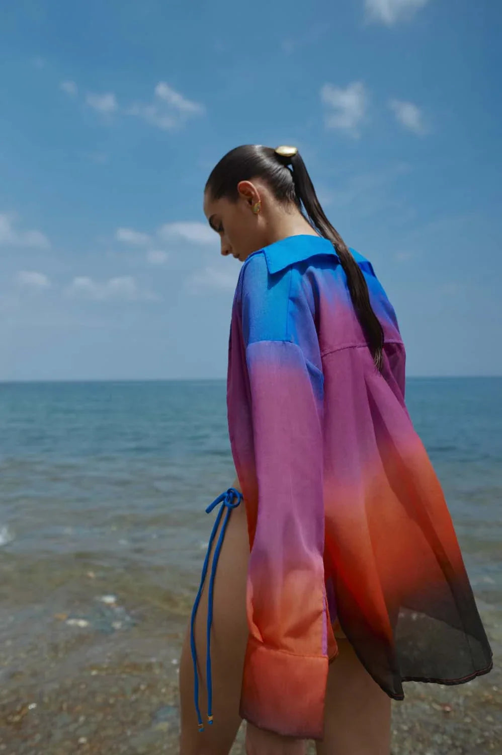 Introducing the "Lulu Shirt" in Northern Lights Ð this semi-transparent long-sleeve shirt features front buttons for a chic, versatile look. Perfect for layering over swimwear or pairing with your favorite denim, this shirt brings a fresh, airy vibe to your wardrobe.