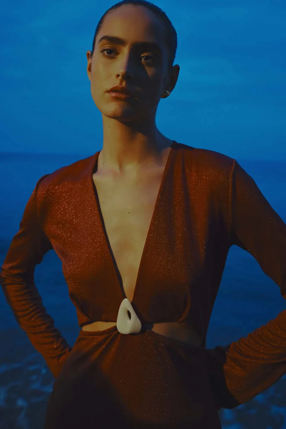 Introducing the "Manola Dress" in Candela – this stunning maxi dress features a deep V-neckline and cup lining for a flattering fit. The front cutouts add a modern touch, while the Baobab-shaped detail enhances its unique design. Perfect for making a bold, elegant statement.