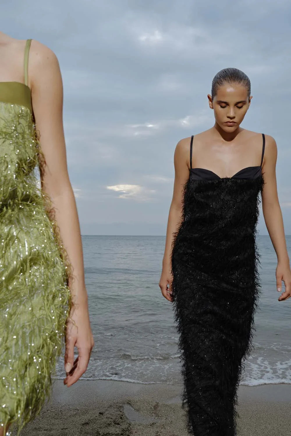 Introducing the "Medusa Dress" in Graphite – this maxi dress features a flattering sweetheart neckline and fringe details with shimmering accents for a glamorous touch. Lined for a smooth fit, the back slit adds an extra touch of allure. An elegant piece that exudes sophistication and bold charm for any occasion.