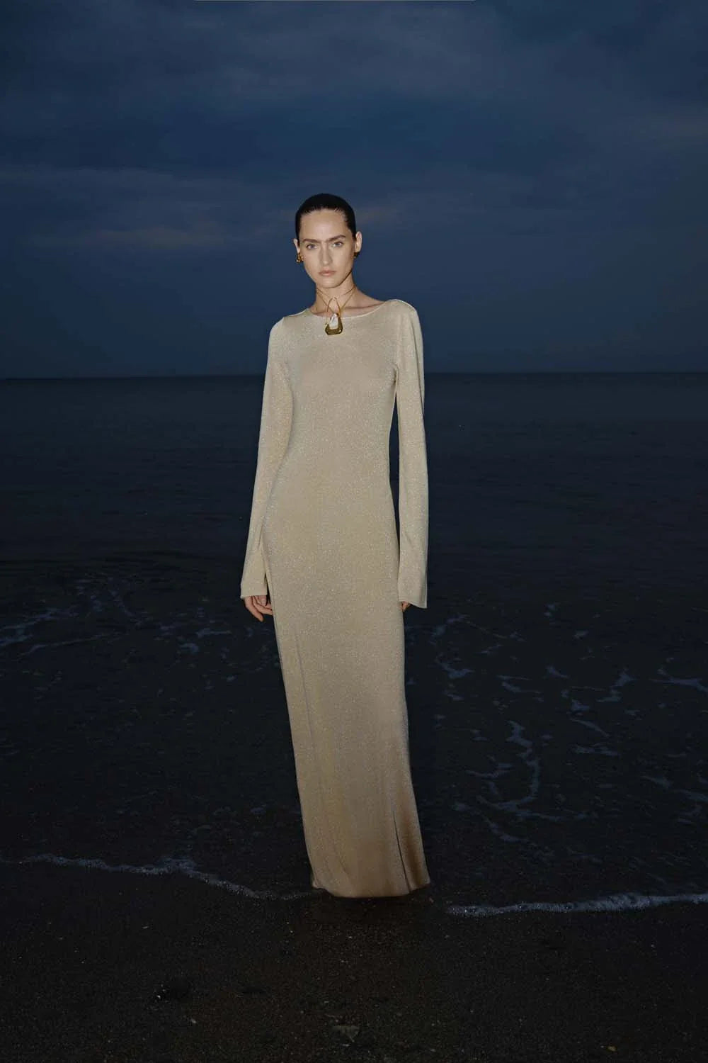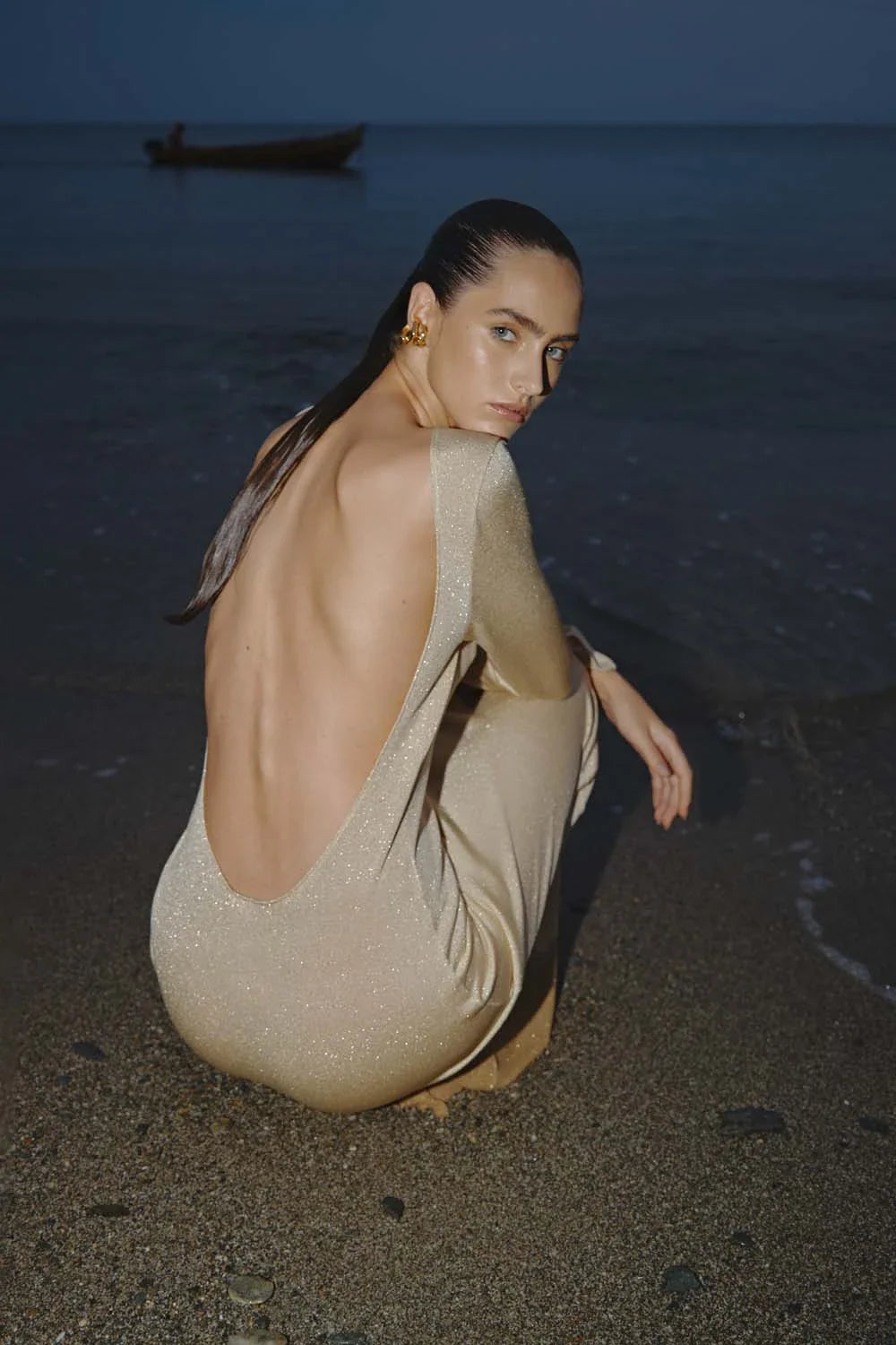Introducing the "Musa Dress" in Almendras – this maxi dress features a round neckline, long sleeves, and a striking open back for a refined yet bold silhouette. Shiny accents add a touch of glamour, while the lined design ensures comfort. Perfect for creating an elegant, sophisticated look for any occasion.