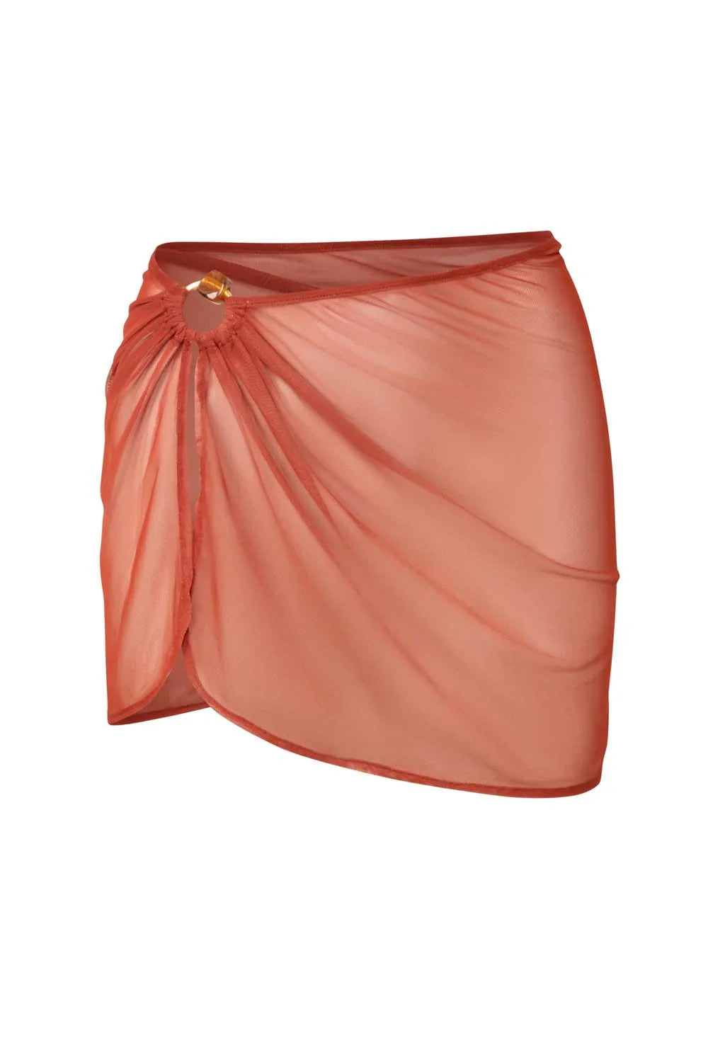 Introducing the "Nerano Mini Pareo" in Spiced Terra – a sheer mesh pareo in a mini length, featuring ruched detailing gathered by a metal ring. Designed with a side slit for fluid movement and an unlined construction for a lightweight feel.