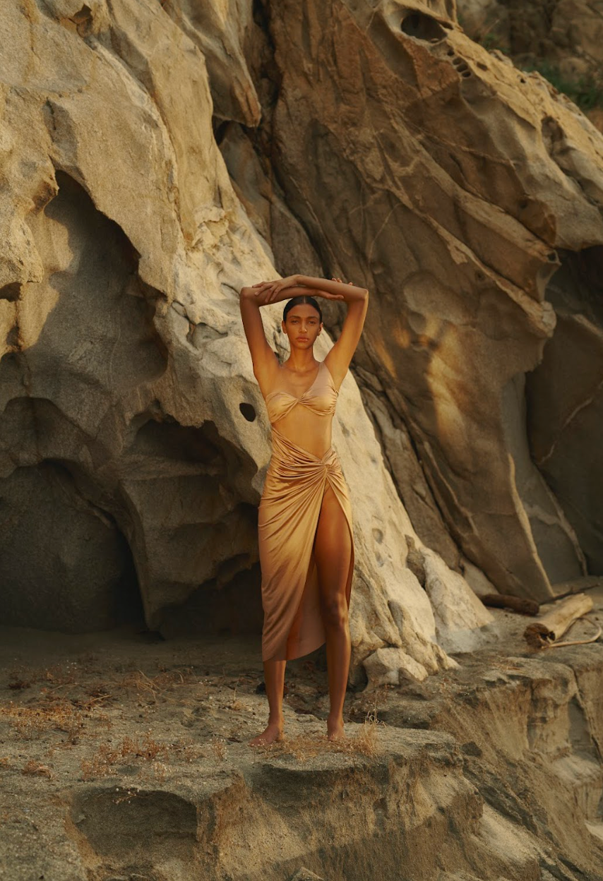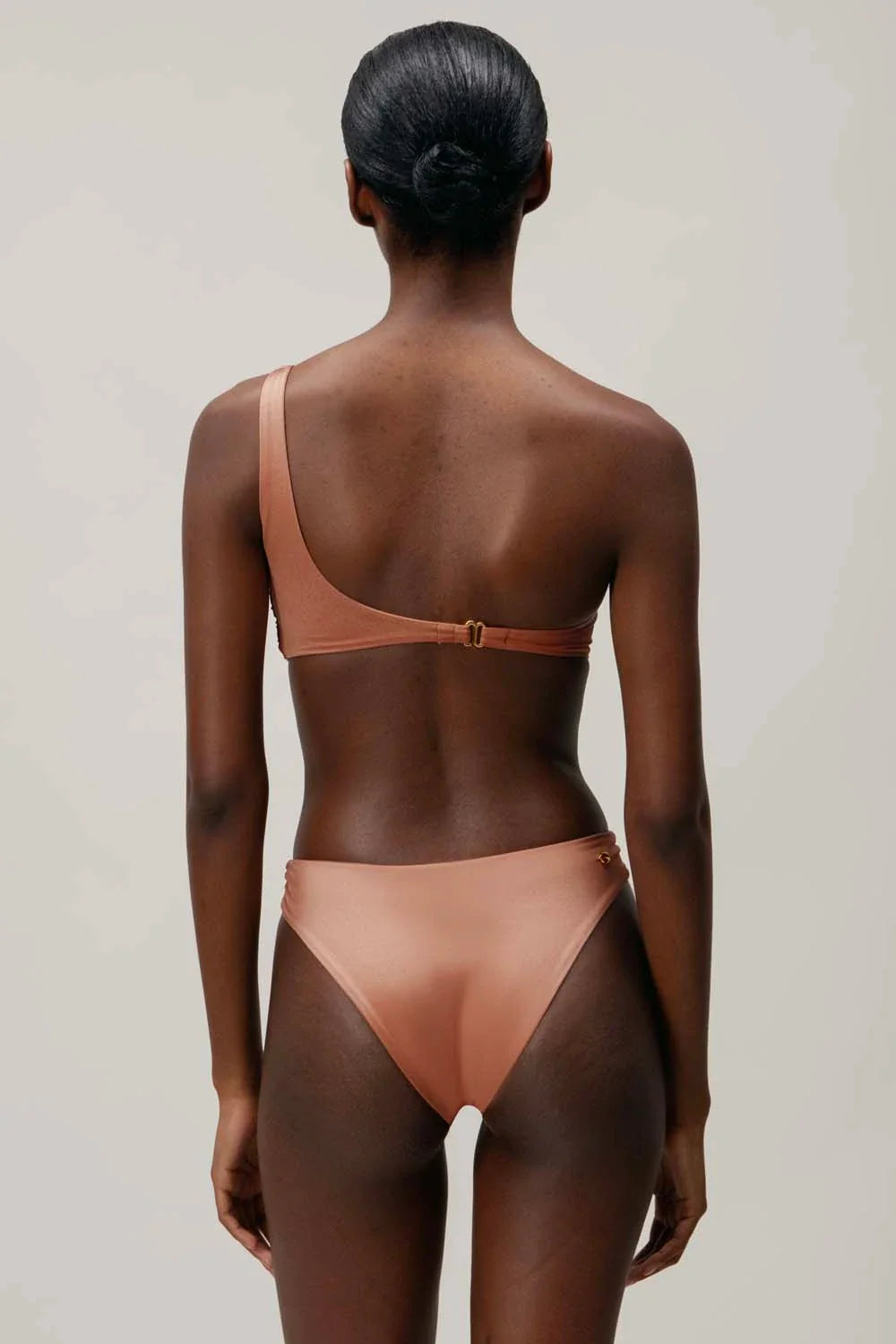 One shoulder twisted bikini top. Low rise bottom. Recycled fabric made out of fishing nets.