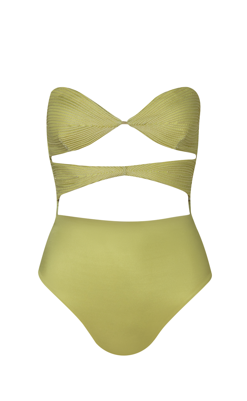 Introducing the "Sol One-Piece" in Vita - A vibrant strapless one-piece featuring intricate embroidery at the top, designed in a bright yellow tone. Crafted from figure-hugging glossy fabric, this versatile piece can be worn as both a bodysuit and a swimsuit, perfect for effortless transitions from beach to street style.