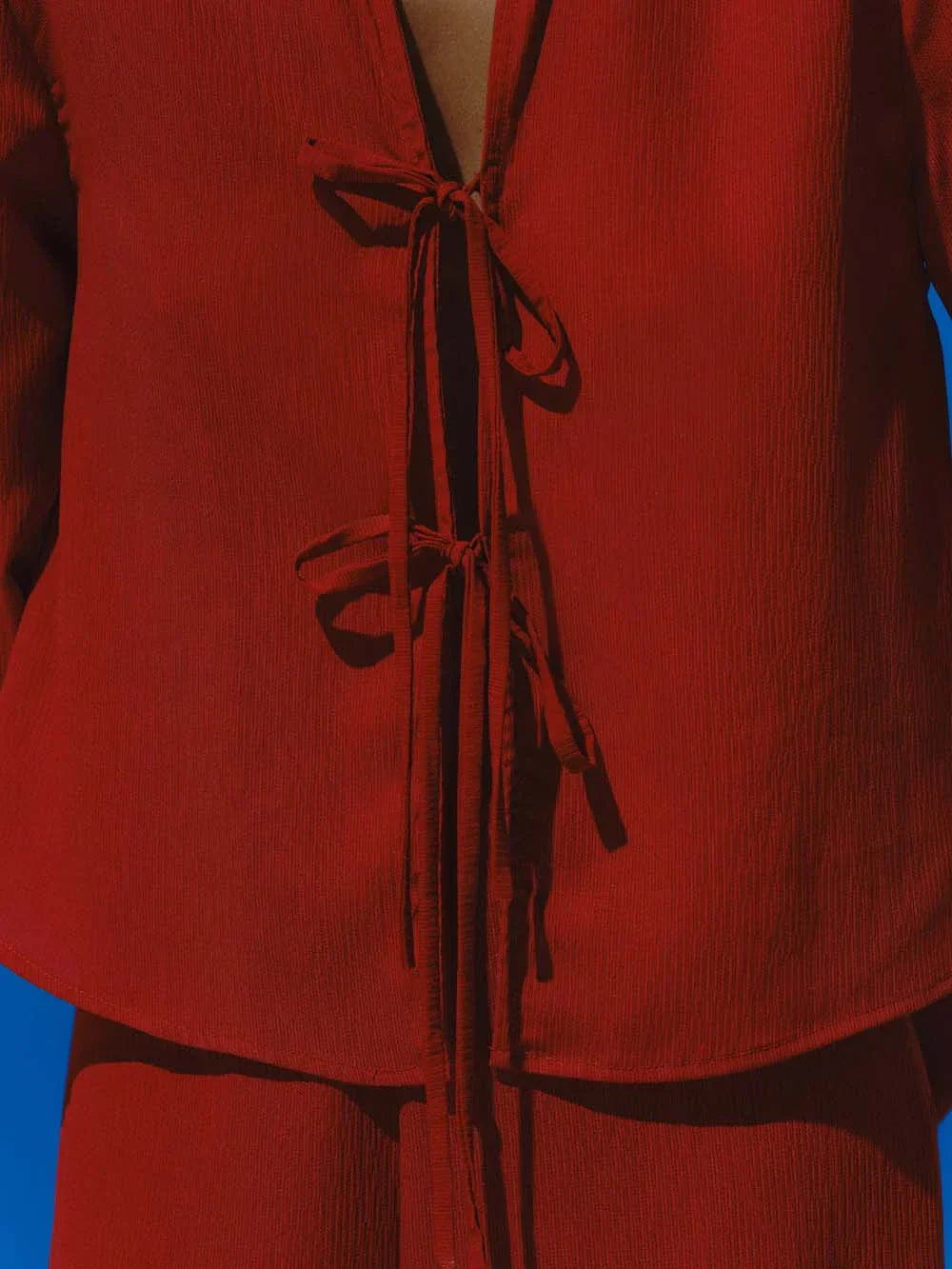 Introducing the "Parma Blouse" in Fire Red – a V-neckline top featuring front slit openings with adjustable ties. Designed with long sleeves and crafted in textured fabric. Unlined for a lightweight feel.