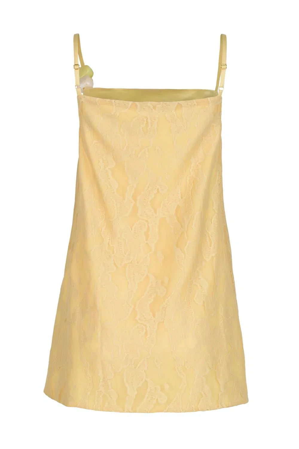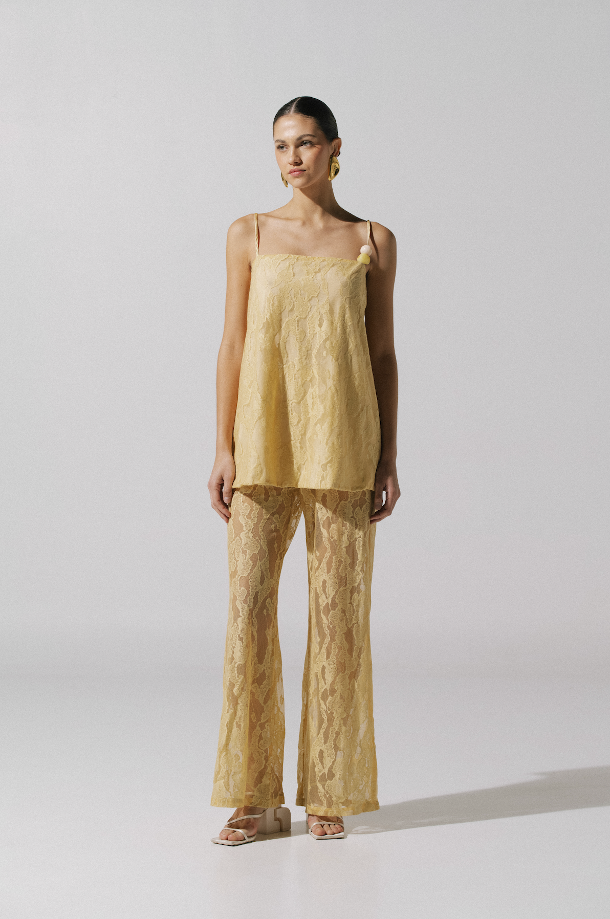 Introducing the "Porto Top" in Butter – a top with a square neckline, adjustable straps, and a delicate lace overlay. Embellished for added detail, it is fully lined for coverage. Pair with matching pieces for a complete look.