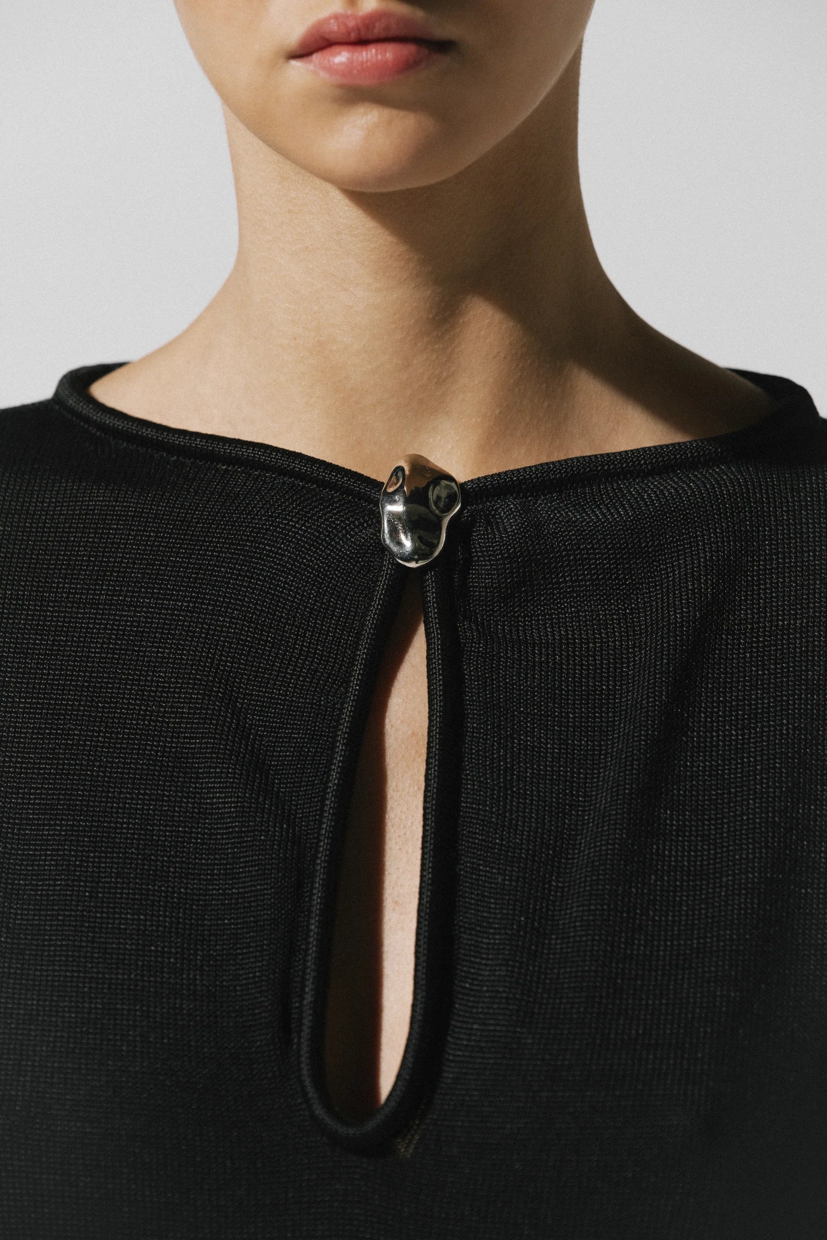 Introducing the "Ramila Maxi Dress" in Black – a knit silhouette with a round neckline and long sleeves. Designed with front cutouts and finished with a Baobab-shaped embellishment. Maxi length for a refined finish.