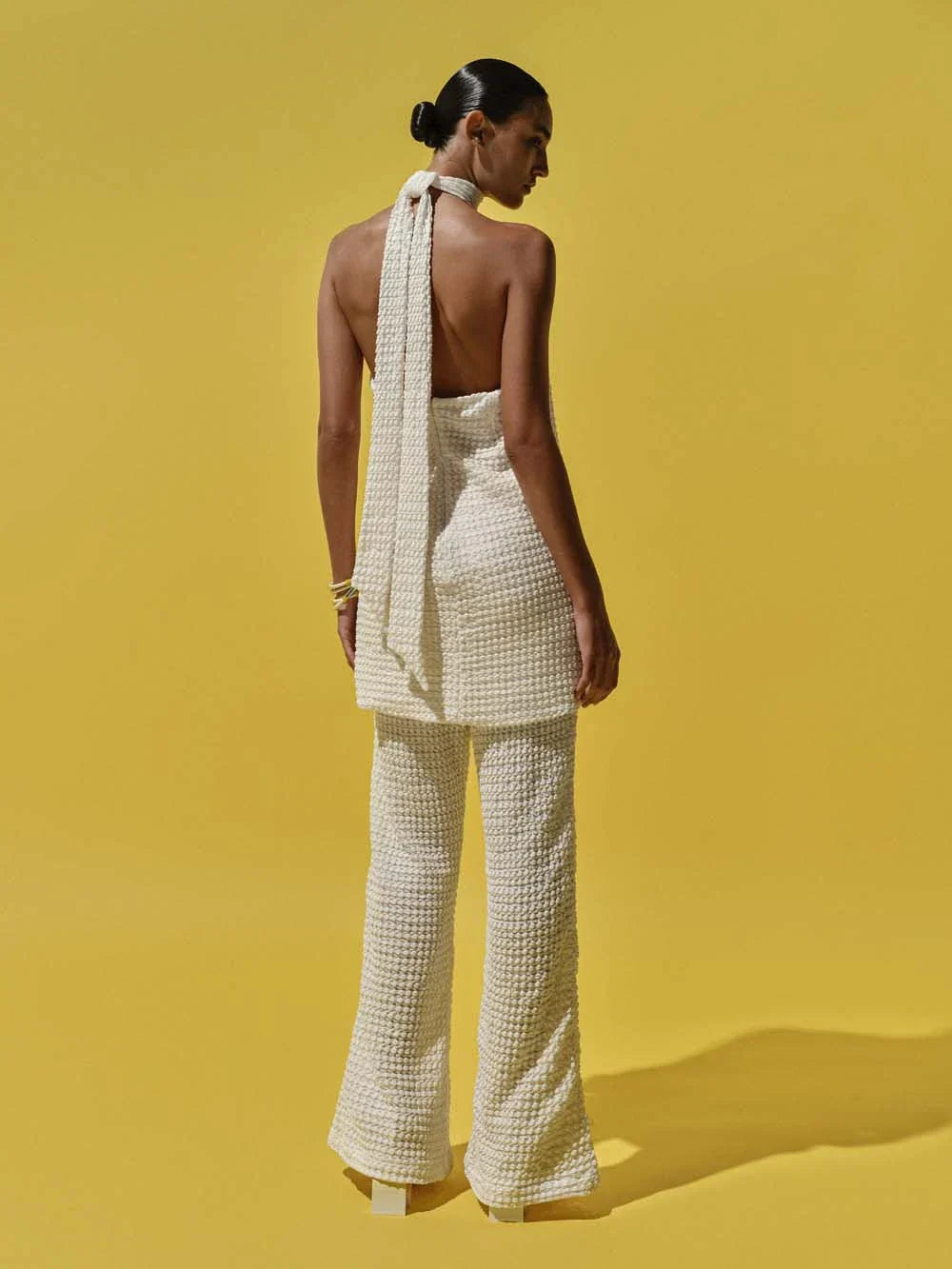 Introducing the "Robin Pants" in Ecru – straight-leg pants crafted in bubble fabric, featuring back darts and a reinforced waistband for structure. Designed with a side zipper closure and left unlined for a lightweight feel. Pair with the matching top for a full look.