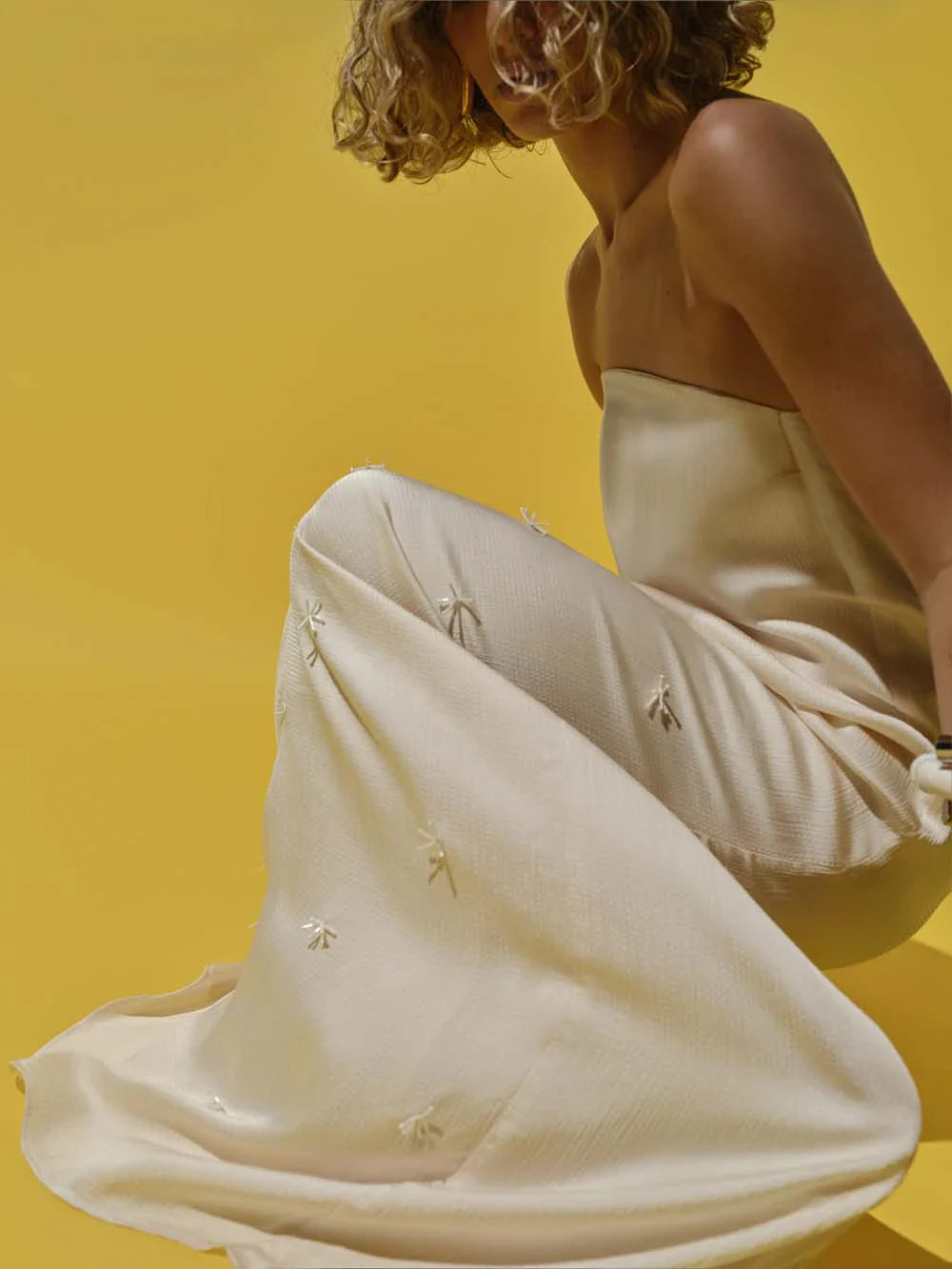 Introducing the "Sage Maxi Dress" in Ivory – a strapless, embellished maxi dress crafted in textured fabric. Features side boning, an elastic silicone grip for support, and a back slit for ease of movement. Finished with a back zipper and full lining.