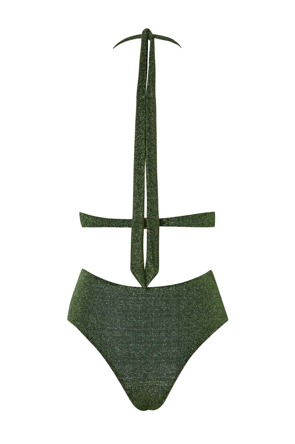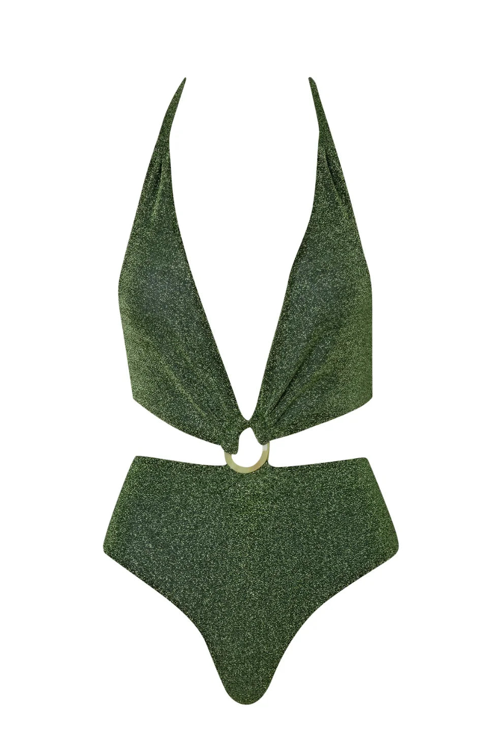 Introducing "Selena One-Piece" in Dua - A deep V-neck one-piece swimsuit crafted from figure-hugging glossy fabric, accentuated with a baobab shape detail at the front. Featuring side cutouts and an open back with ties for adjustable fit and style.