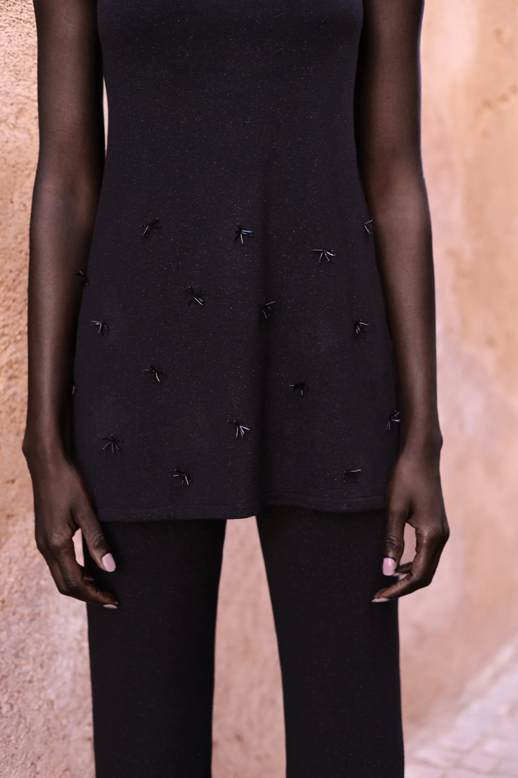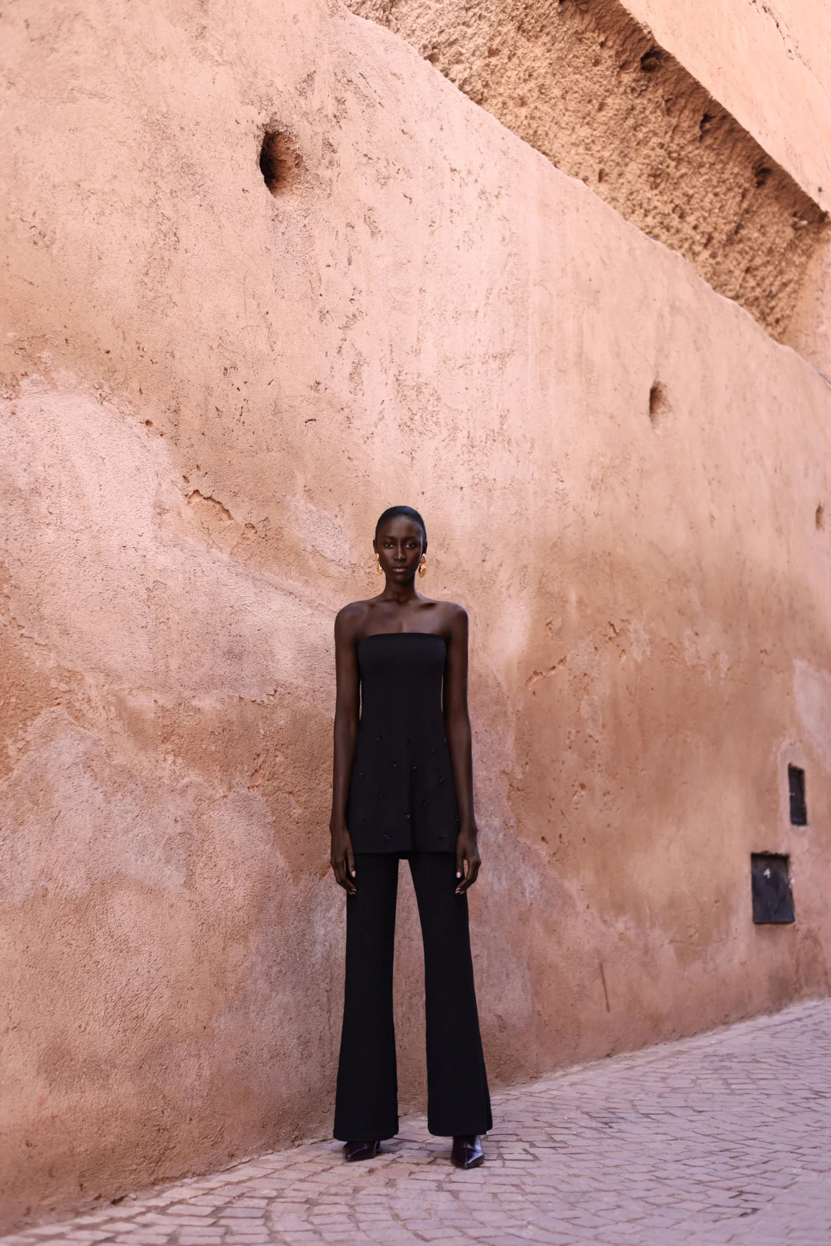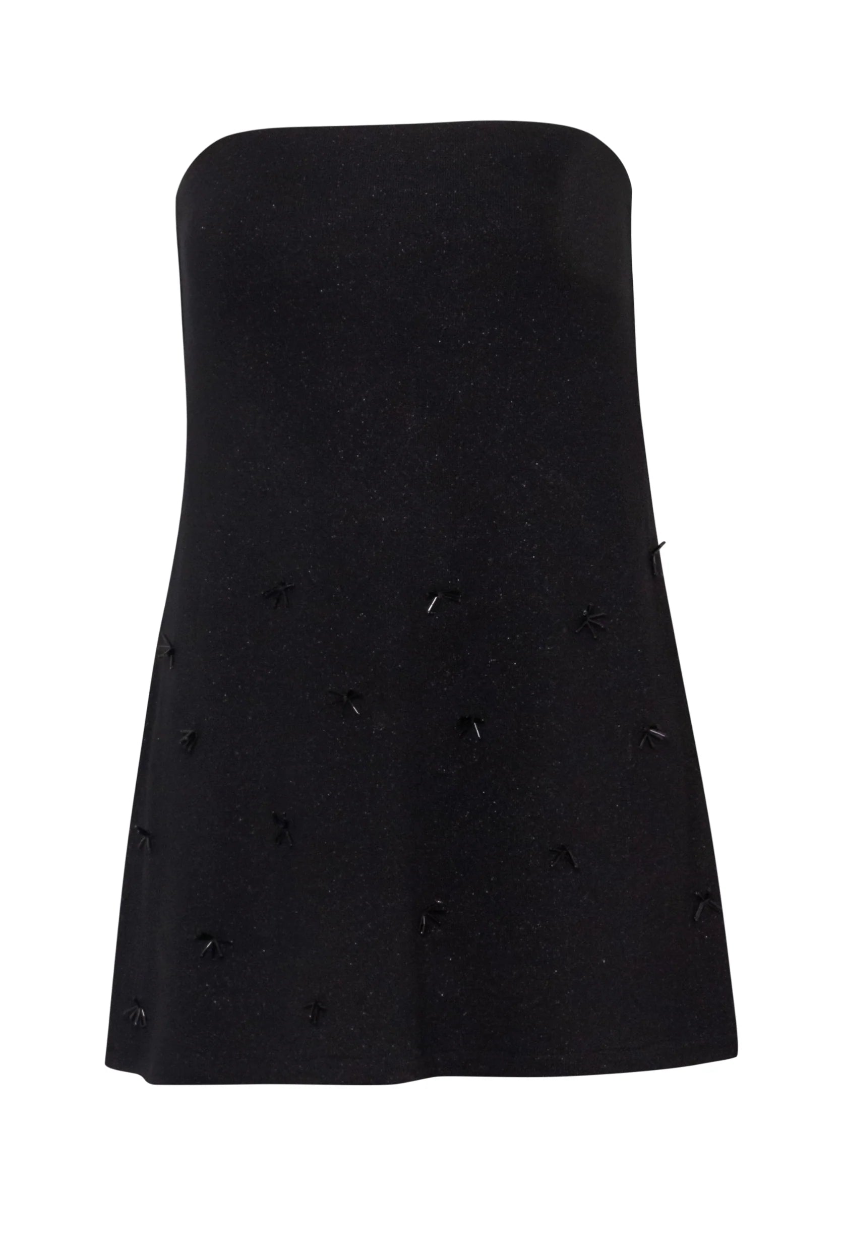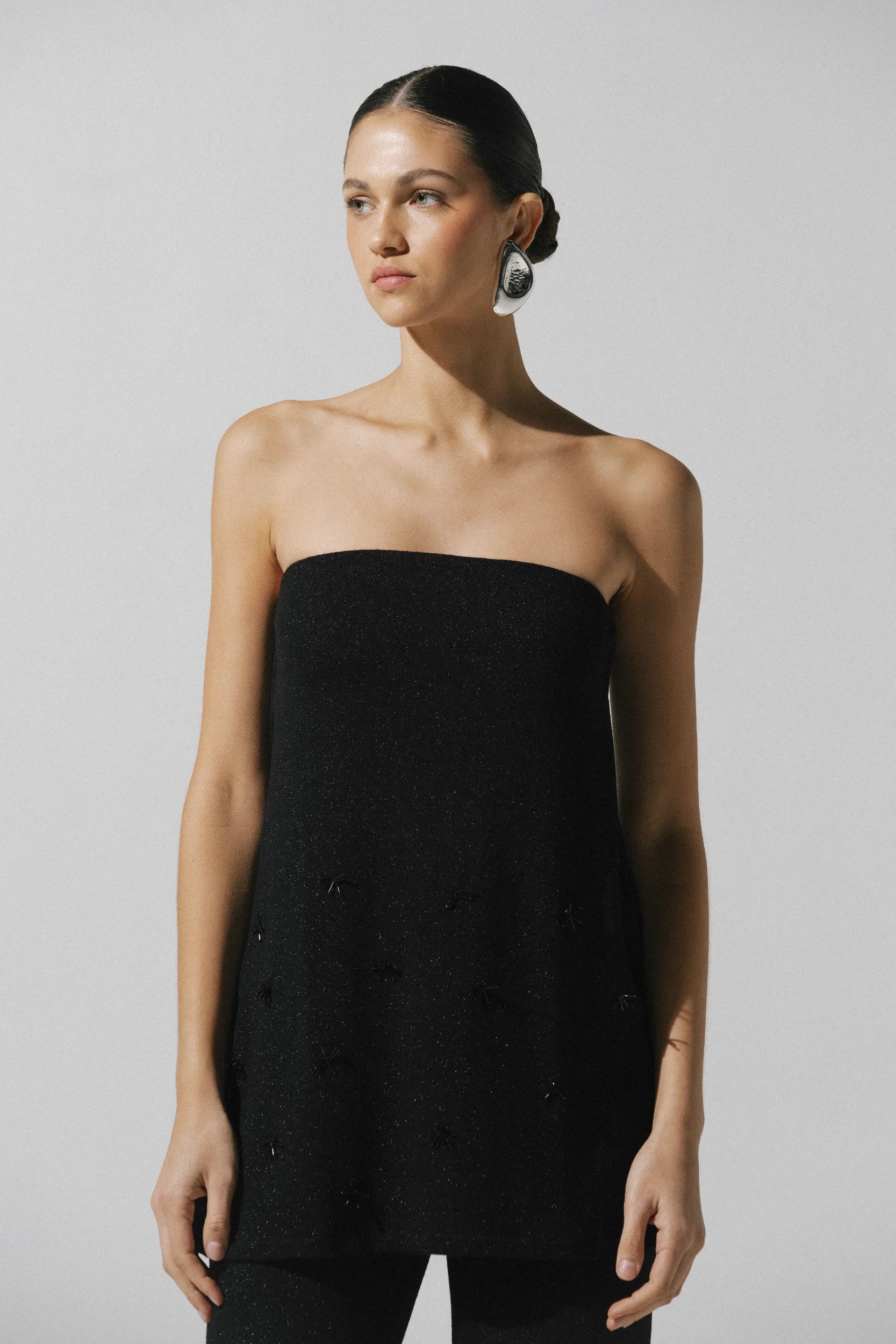 Introducing the "Suzu Top" in Black – a strapless silhouette crafted from shiny fabric with embellished accents. Designed with side boning and an elastic silicone grip for structure and support. Partially lined for a lightweight finish. Pair it with the matching bottom for a coordinated look.