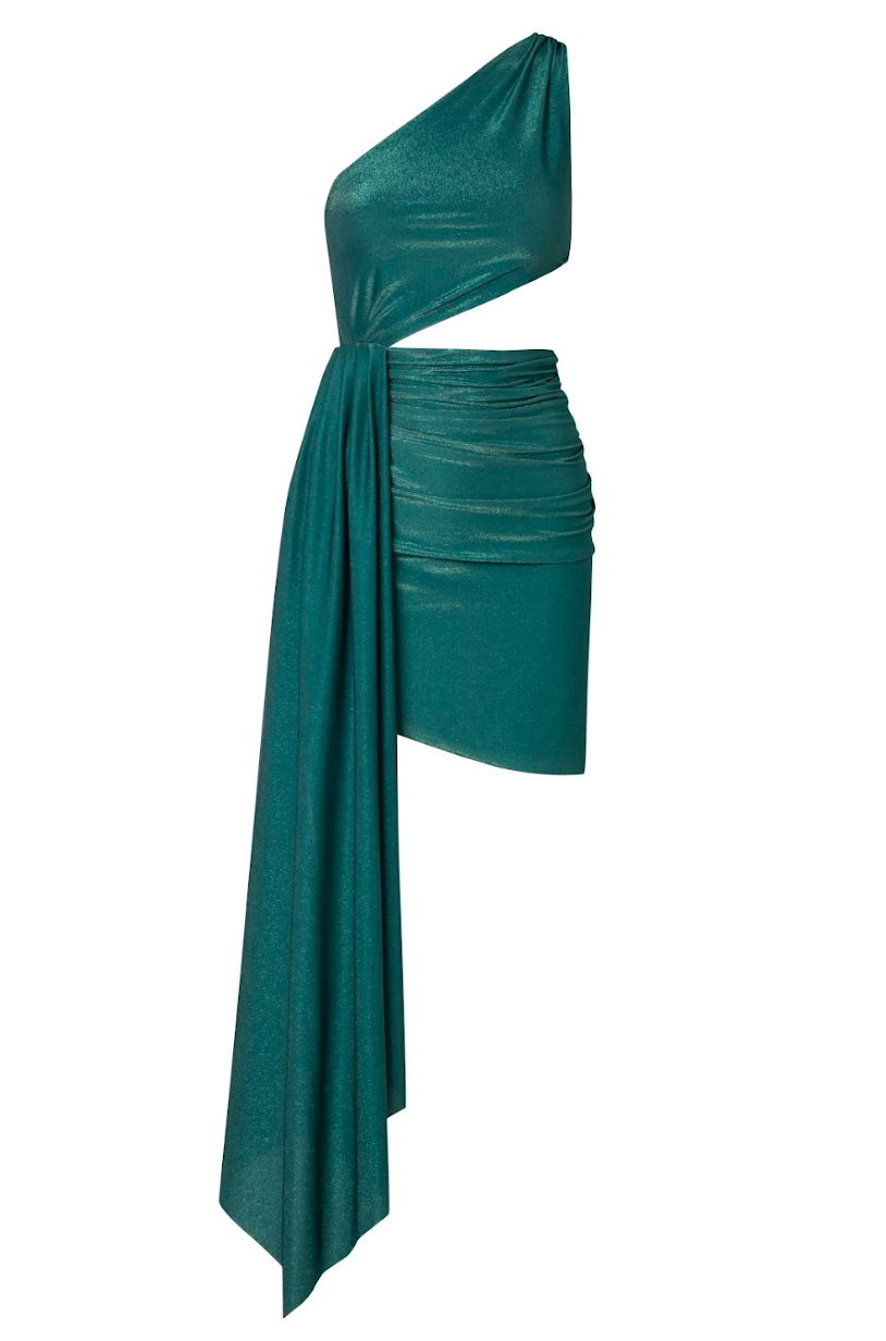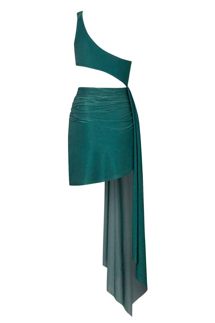 Introducing the "Zadeh Mini Dress" in Evergreen Ð A harmonious fusion of luxury beachwear and resort wear for women. This ethereal one-shoulder mini dress with cut-out and side detail transcends style, elevating your summer wardrobe. Fabricated in a lycra, figure-hugging shiny material the "Zadeh Mini Dress" elevates your resort-wear collection.